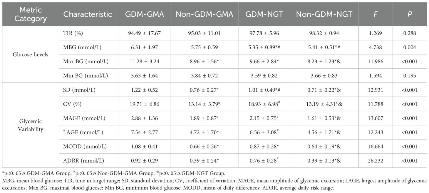 Table 2 summarizes the CGM results for women 4–7 years postpartum. Regardless of GDM status, the GMA group had a higher mean blood glucose (MBG) level than the NGT groups [(6.31 ± 1.97,5.75 ± 0.59)vs. (5.35 ± 0.89,5.41 ± 0.51),p=0.004]. The GDM-GMA subgroup exhibited the highest maximum blood glucose (Max BG) levels among all groups[(11.28 ± 3.24)vs. (8.96 ± 1.56,9.66 ± 2.84,8.23 ± 1.23),p<0.001], even within the NGT group, women with prior GDM displayed elevated Max BG levels compared to their non-GDM counterparts(9.66 ± 2.84vs.8.23 ± 1.23,p< 0.001].