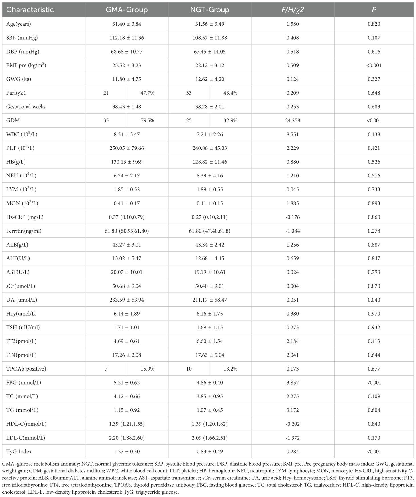 Table 3 compares the baseline characteristics of women in the GMA and NGT groups during the perinatal period. The pre-pregnancy BMI of the GMA group was significantly higher than that of the NGT group (25.52 ± 3.23 vs. 22.12 ± 3.12, p< 0.001). The uric acid (UA) level in the GMA group was higher than in the NGT group (233.59 ± 53.94 vs. 211.17 ± 58.47, p = 0.040). The incidence of GDM in the GMA group was significantly higher than that in the NGT group (79.5% vs. 32.9%, p< 0.001), and FBG was also elevated (5.21 ± 0.62 vs. 4.86 ± 0.40, p< 0.001). Similarly, the IR marker TyG index was significantly higher in the GMA group (1.27 ± 0.30 vs. 0.83 ± 0.49, p< 0.001) compared to the NGT group.