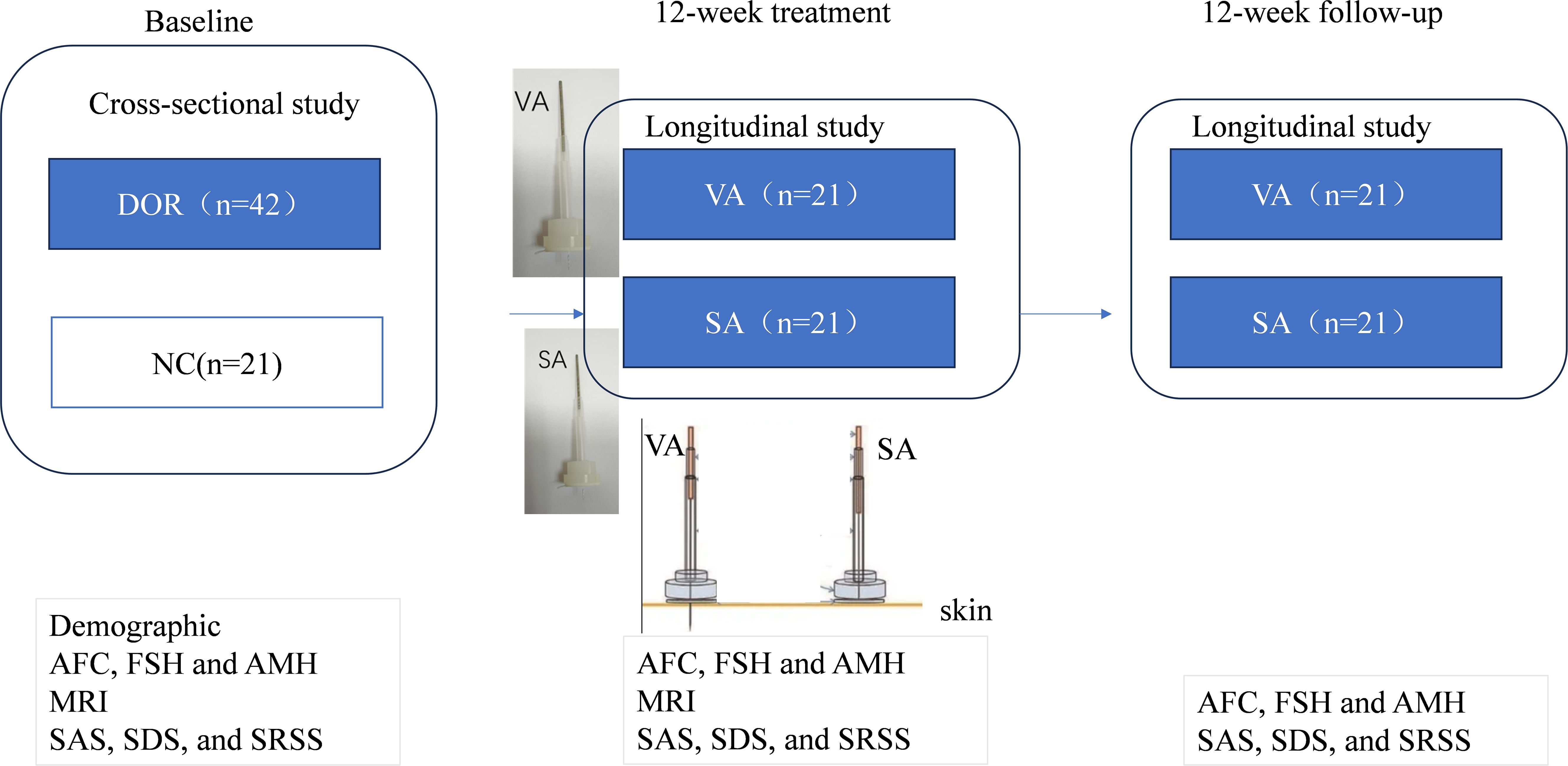 Demographic and clinical outcome analyses will be conducted using SPSS 22.0 software. In the cross-sectional study, two-sample t-tests and Chi-square tests will be employed to compare baseline characteristics between the DOR patient group and HCs. In the longitudinal study, paired t-tests will be used to compare changes in clinical symptoms (SAS, SDS, and SRSS scores) and laboratory test results (AFC, FSH, and AMH) within each group before and after treatment. Subsequently, a two-way analysis of variance (ANOVA), with time as the within-subject factor, will be applied to examine differences in clinical symptoms between the VA and SA groups before and after treatment. A p-value of < 0.05 will be considered statistically significant.