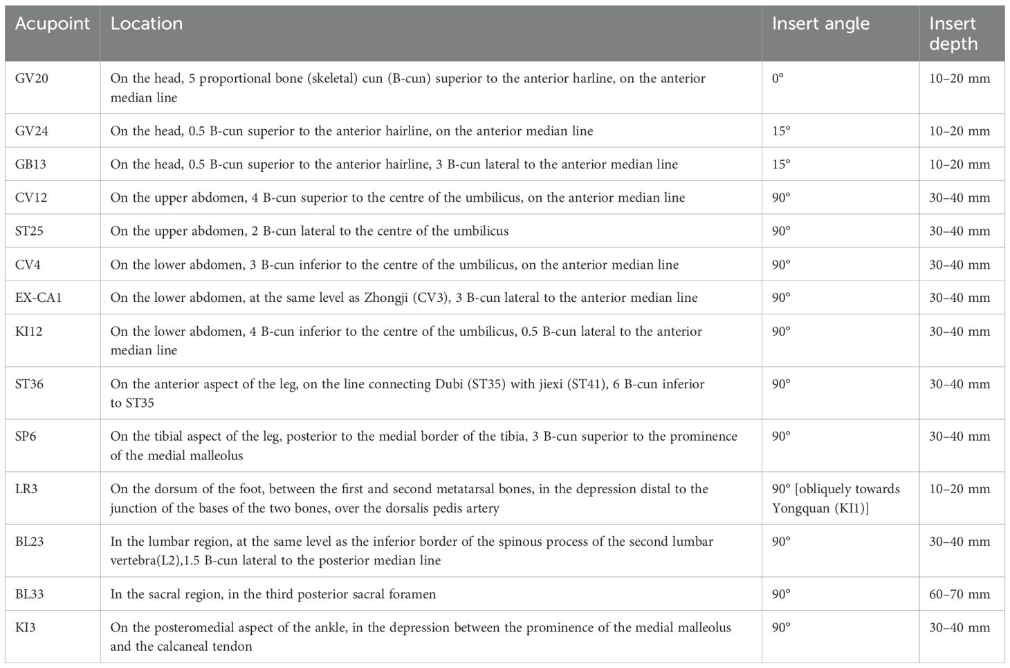 According to TCM principles, different researchers may have varying views on the underlying mechanisms. ZHAN’s team identified kidney deficiency, liver-Qi stagnation, and dysfunction of the Thoroughfare and Conception vessels as the most relevant factors (39). Based on our clinical experience, our team primarily attributes the condition to kidney deficiency, dysfunction of the Thoroughfare and Conception vessels, and the reciprocal relationship between emotional imbalance and the disease. We selected 14 specific acupuncture points based on these TCM principles and our previous study; to target the dysfunctions of Kidney, Thoroughfare Vessel and Conception Vessel associated with DOR. Based on the pathways of the meridians and the close connection between the primary disease and its manifestations, particular emphasis is placed on the importance of the Governor, Conception, and Thoroughfare vessels in gynecological conditions. Fourteen acupoints are selected to tonify kidney essence, regulate the Governor, Conception, and Thoroughfare vessels, and calm the mind, following these therapeutic principles (26). To tonify the kidney, the primary acupoints are Shenshu (BL23) and Taixi (KI3). To regulate the function of the Conception and Thoroughfare vessels, the selected acupoints include Dahe (KI12), Guanyuan (CV4), Zhongwan (CV12), Tianshu (ST25), Zusanli (ST36), and Sanyinjiao (SP6). To calm the mind and regulate emotions, the acupoints Baihui (GV20), Shenting (GV24), Benshen (GB13), and Taichong (LR3) are chosen. Additionally, Ciliao (BL33) and Zigong (EX-CA1) are utilized for their unique therapeutic effects on pelvic diseases and ovarian dysfunction. The treatment focuses on restoring the imbalance of the “emotional (brain) – kidney – Tian Gui – Conception and Thoroughfare vessels – uterus” reproductive axis, with the primary therapeutic principles being “regulating the Conception and Thoroughfare vessels, calming the mind, and tonifying the liver and kidney.” This combination of acupoints addresses both the physiological and emotional aspects of gynecological conditions, aiming to restore balance, improve ovarian function, and regulate emotional well-being (40).