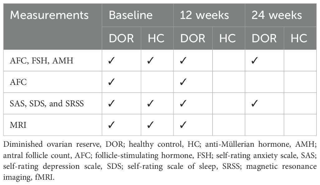 Preprocessing of MRI images will be conducted using the DPARSF (http://rfmri.org) and SPM 12 (www.fil.ion.ucl.ac.uk/spm) toolkits within MATLAB 2014b (MathWorks, Natick, MA). The preprocessing pipeline will include the following steps: (1) removal of the first 10 volumes; (2) slice timing correction; (3) realignment of images to correct for head motion; (4) co-registration of T1-weighted images with functional images; (5) normalization of T1 images to Montreal Neurological Institute (MNI) space, followed by segmentation into gray matter, white matter, and cerebrospinal fluid; (6) spatial smoothing of the images using an isotropic Gaussian kernel with a full width at half maximum (FWHM) of 6 mm; (7) temporal bandpass filtering (0.01-0.08 Hz); and (8) regression of nuisance signals, including global mean, white matter, cerebrospinal fluid signals, and six motion parameters. Considering the aim is to estimate the relationship between ovarian and brain and the hypothalamic-pituitary-ovarian (HPO) axis, the region of interest (ROI) will be selected as the hypothalamus. For static functional connectivity (FC) analysis, Pearson’s correlation coefficients between the reference time series of each seed and the time series of all brain voxels will be computed. These coefficients will then be transformed into z-scores using Fisher’s z-transformation to enhance normality (24). Two-sample t-tests will be conducted to identify significant differences in FC between the DOR and healthy control (HC) groups, with age and mean framewise displacement (FD) as covariates. Moreover, Kisspeptin is a key regulator of gonadotropin secretion and is primarily located in the rostral preoptic area and the infundibular nucleus of the human hypothalamus (37). In this study, we will refer to the segmentation method described in Ogawa (38) to perform subregion segmentation of the hypothalamus in our subjects, with a particular focus on the rostral preoptic area and the infundibular nucleus, as well as the whole-brain FC. For the longitudinal analysis, paired t-tests will be used to compare within-group statistical maps, while a two-way analysis of variance (ANOVA) will be applied to compare between-group statistical maps. Multiple comparisons will be corrected for using a threshold of p < 0.05 at the voxel level and p < 0.05 at the cluster level, with false discovery rate (FDR) correction.