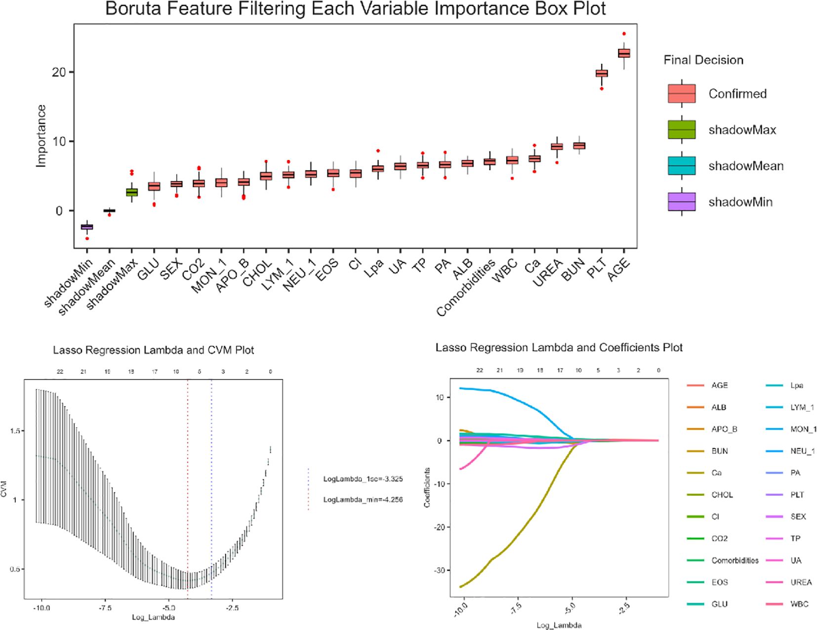 Figure 2 displays the distribution of variable importance scores across multiple iterations, comparing original features with synthetic shadow features (random noise variables).Representative features such as age, PLT, BUN demonstrated stable importance across iterations (narrow boxplot ranges), suggesting their strong association with the outcome. Four variables (not shown in figure) fell below the shadowMin threshold and were rejected as irrelevant. The Lasso regression analysis identified a parsimonious set of 8 clinically relevant predictors from the initial 39 variables (Figure 2): sex, age, PLT, EOS, LYM, CO2, GLU, APO-B. APO-B (β=−0.02, negative association), suggesting a potential protective role in the disease progression, EOS (β=+0.22) and GLU (β=+0.06), indicating their positive correlations with adverse outcomes.