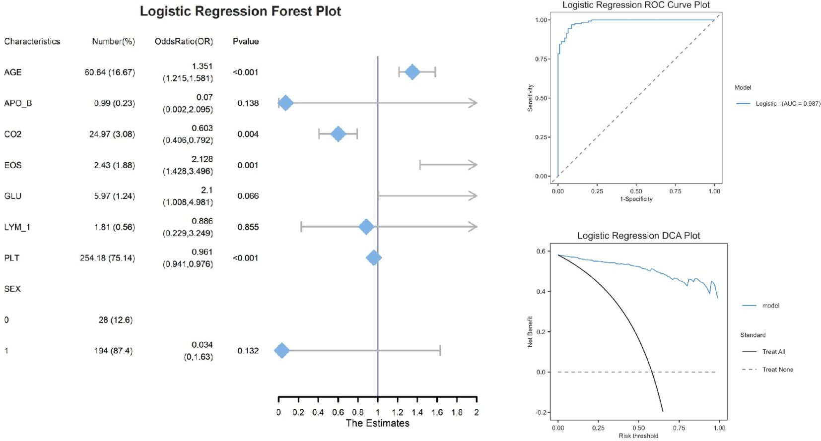 Conclusion: The logistic regression analysis revealed that age (OR=1.351, p<0.001), CO2 (OR=0.603, p=0.004), eosinophil count (OR=2.128, p=0.001), and platelet count (OR=0.961, p<0.001) were significantly associated with the outcome, indicating their potential roles as independent predictors. Notably, while APO_B (p=0.138) and sex (p=0.132) showed no significant association, glucose levels (OR=2.1, p=0.066) exhibited a marginal trend toward significance, warranting further investigation. This tool may support clinicians in identifying high-risk individuals, enabling early interventions and optimized management strategies.