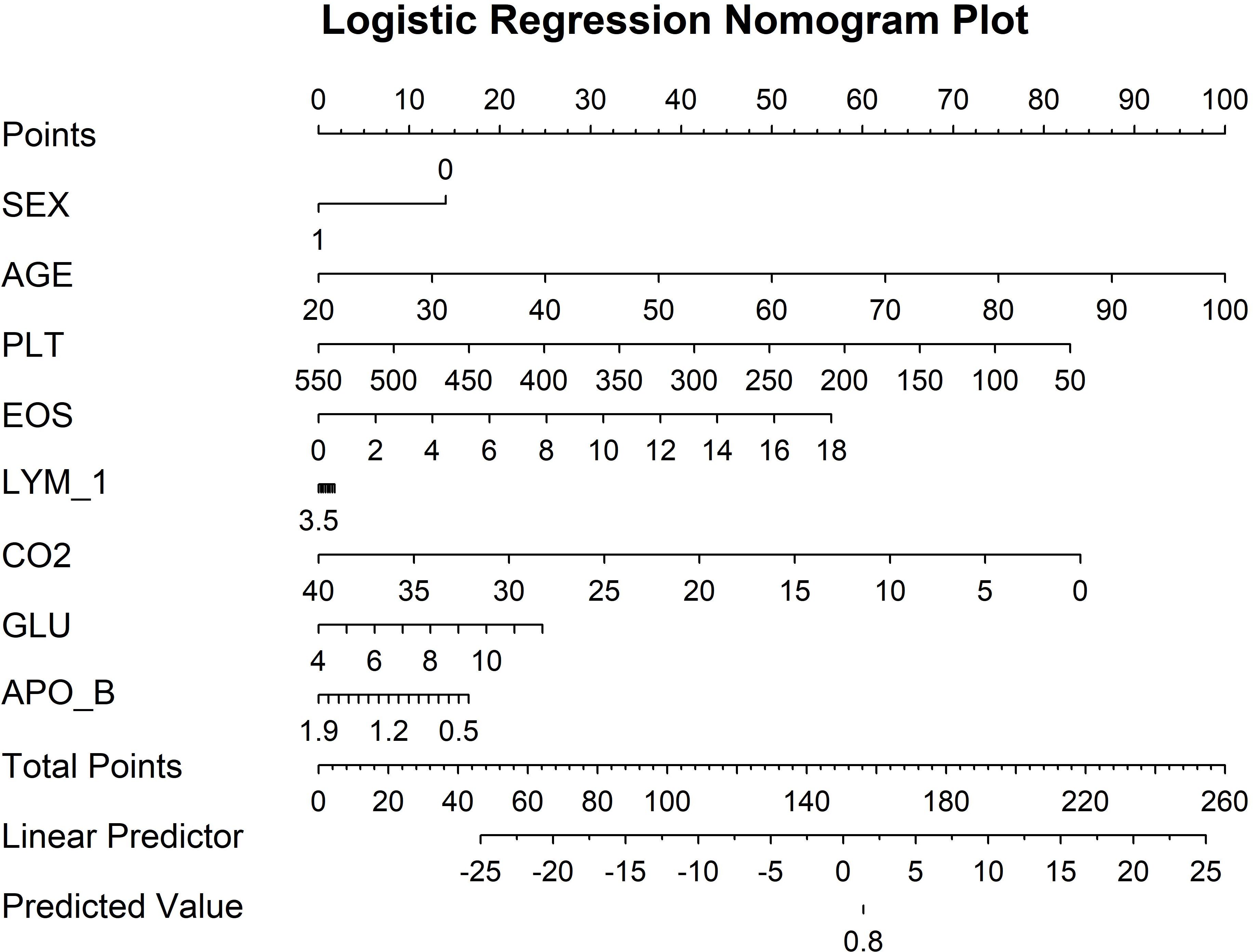 The logistic regression analysis (Figure 2) identified four significant predictors of [outcome]: AGE (OR=1.351, 95% CI:1.215–1.581, P<0.001), CO2 (OR=0.603, 95% CI:0.406–0.792, P=0.004), EOS (OR=2.128, 95% CI:1.428–3.496, P=0.001), and PLT (OR=0.961, 95% CI:0.941–0.976, P<0.001). Notably, AGE and EOS exhibited strong positive associations, while higher CO2 and PLT levels were protective. Variables such as APO_B (P=0.138) and SEX (P=0.132) did not reach statistical significance, possibly due to limited effect sizes or sample heterogeneity. The logistic regression model demonstrated excellent discriminative ability, with an area under the ROC curve (AUC) of 0.987. Decision curve analysis demonstrated that the logistic regression model provided superior net benefit compared to the ‘Treat All’ or ‘Treat None’ strategies across a clinically relevant risk threshold range (0.2–0.6). For example, at a threshold probability of 30% (a common cutoff for clinical intervention), the model yielded a net benefit of 0.45, whereas ‘Treat All’ and ‘Treat None’ resulted in 0.25 and 0, respectively. This suggests that using the model to guide decisions could prevent unnecessary treatments for 20% of patients without missing high-risk cases. The nomogram (Figure 3) integrated eight clinically accessible variables, with AGE and EOS contributing the highest point weights.