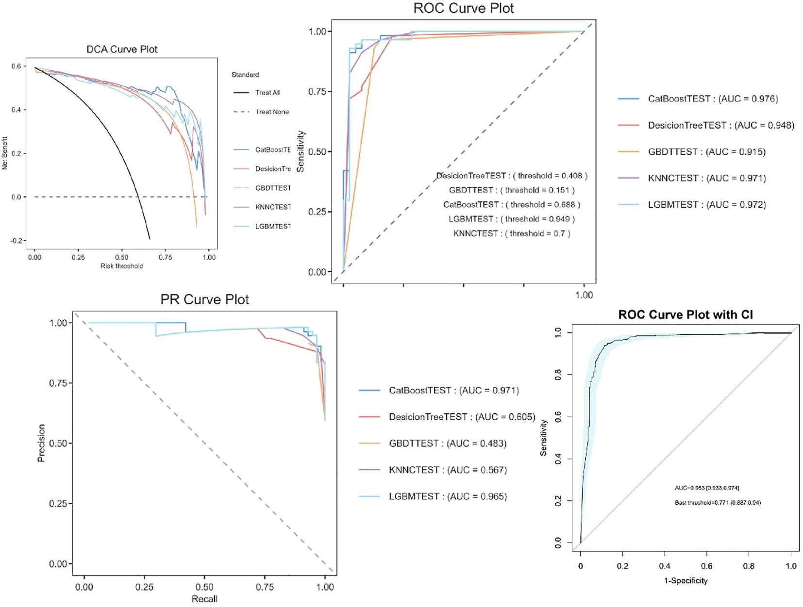 Comparative analysis of five machine learning models revealed that ensemble methods consistently outperformed single-model approaches (Supplementary 8). The CatBoost learner achieved the highest discriminative ability (AUC=0.953, 95% CI: 0.933–0.974), with a sensitivity of 88.7% and specificity of 94% at the optimal threshold (0.771). LightGBM (AUC=0.972) and KNNC (AUC=0.971) followed closely, while Decision Trees (AUC=0.948) and GBDT (AUC=0.915) exhibited limited performance, likely due to their inability to handle complex feature interactions.