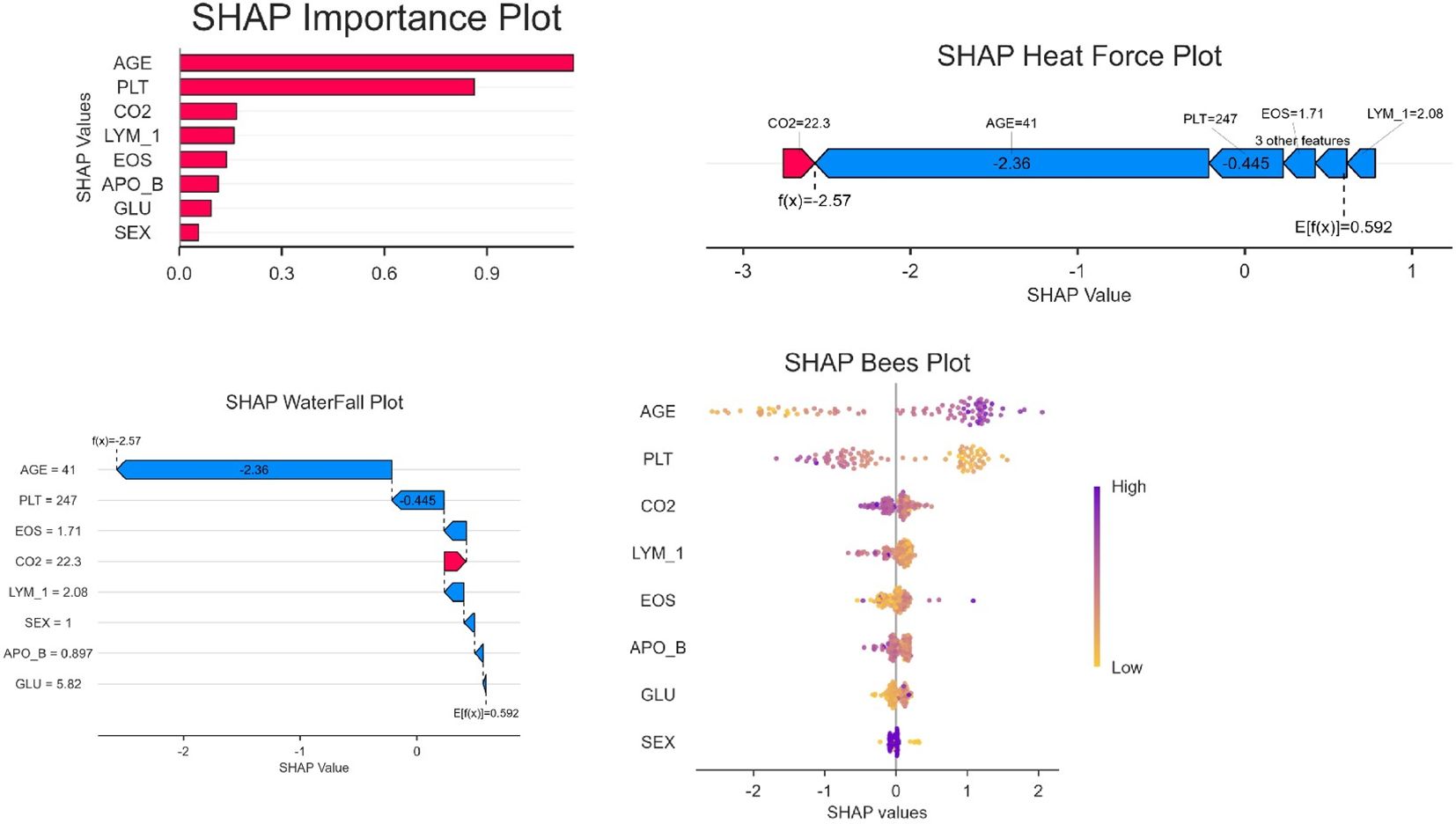 The SHAP feature importance analysis (Figure 5) identified AGE as the most influential predictor (mean |SHAP value|=0.9), followed by PLT (0.6) and CO2 (0.45). In contrast, demographic variables such as SEX (0.1) showed minimal contributions, suggesting that clinical biomarkers drive the model’s decisions more strongly than baseline characteristics. The top SHAP features (AGE, PLT) correspond to the variables retained in the logistic regression nomogram (Figure 2), reinforcing their biological plausibility. CatBoost’s superior AUC may stem from its ability to capture non-linear relationships in high-importance features like AGE, whereas simpler models (e.g., Decision Trees) underutilized these patterns.
