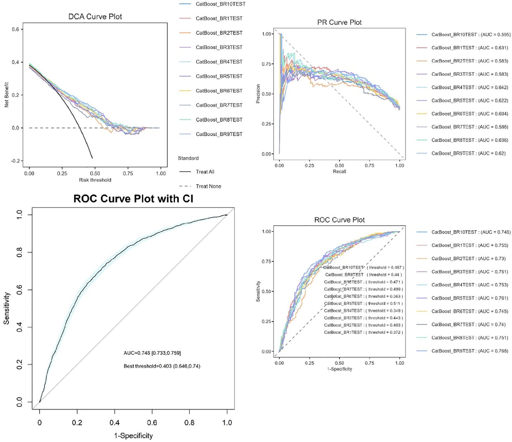 Ten bootstrap-validated CatBoost models (BR1TEST-BR11TEST) demonstrated moderate to strong discriminative ability, with AUC values ranging from 0.686 to 0.744 (median AUC=0.726, IQR: 0.711–0.731). Classification thresholds varied between 0.318 and 0.476, reflecting dataset heterogeneity (Figure 6). The most stable model (BR7TEST) achieved the highest AUC (0.744) at a threshold of 0.447. Threshold variability (0.318–0.476) underscores the importance of tailoring decision cutoffs to clinical priorities—selecting BR7TEST (high specificity) for confirmatory testing or BR6TEST (low threshold=0.318) for sensitive screening.