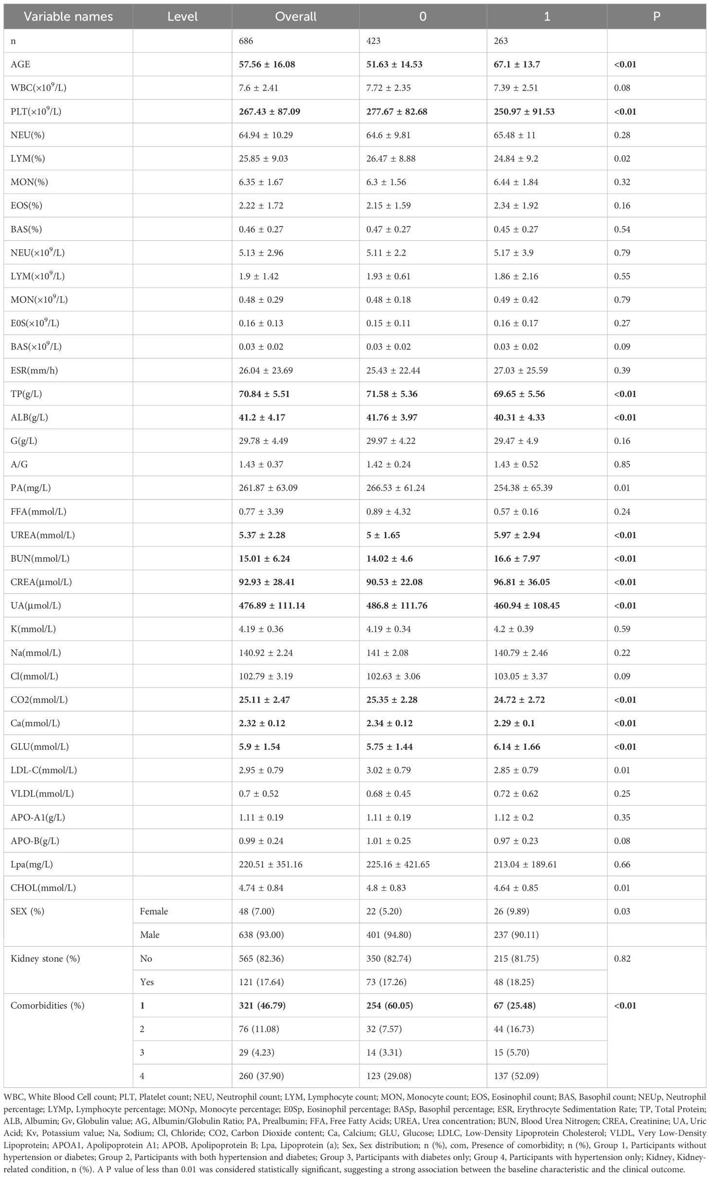 This study included a total of 686 patients, among whom 263 experienced cardiovascular events (CVE group) and 423 did not (non-CVE group). The mean age of the overall cohort was 57.56 years, with CVE patients significantly older than non-CVE patients (67.1 ± 13.7 vs. 51.63 ± 14.53 years, P < 0.01, SMD = 1.10). Sex distribution revealed a higher proportion of males in both groups, although the difference was statistically significant (P = 0.03). Comparison of baseline laboratory parameters showed that patients in the CVE group had significantly lower platelet counts (PLT), lymphocyte percentages (LYM), total protein (TP), albumin (ALB), prealbumin (PA), and calcium (Ca), and higher blood urea (UREA), blood urea nitrogen (BUN), creatinine (CREA), uric acid (UA), glucose (GLU), low-density lipoprotein cholesterol (LDL-C), and comorbidity burden (P < 0.05 for all). Additionally, statistically significant differences were observed in CO2, sodium (Na), and several lipid-related markers such as LDL-C and GLU levels. Among categorical variables, comorbidity profiles were markedly different between groups: a higher proportion of CVE patients had fewer comorbidities, particularly those without hypertension or diabetes conditions (P < 0.01, SMD = 0.75). Detailed comparisons are presented in Table 1.