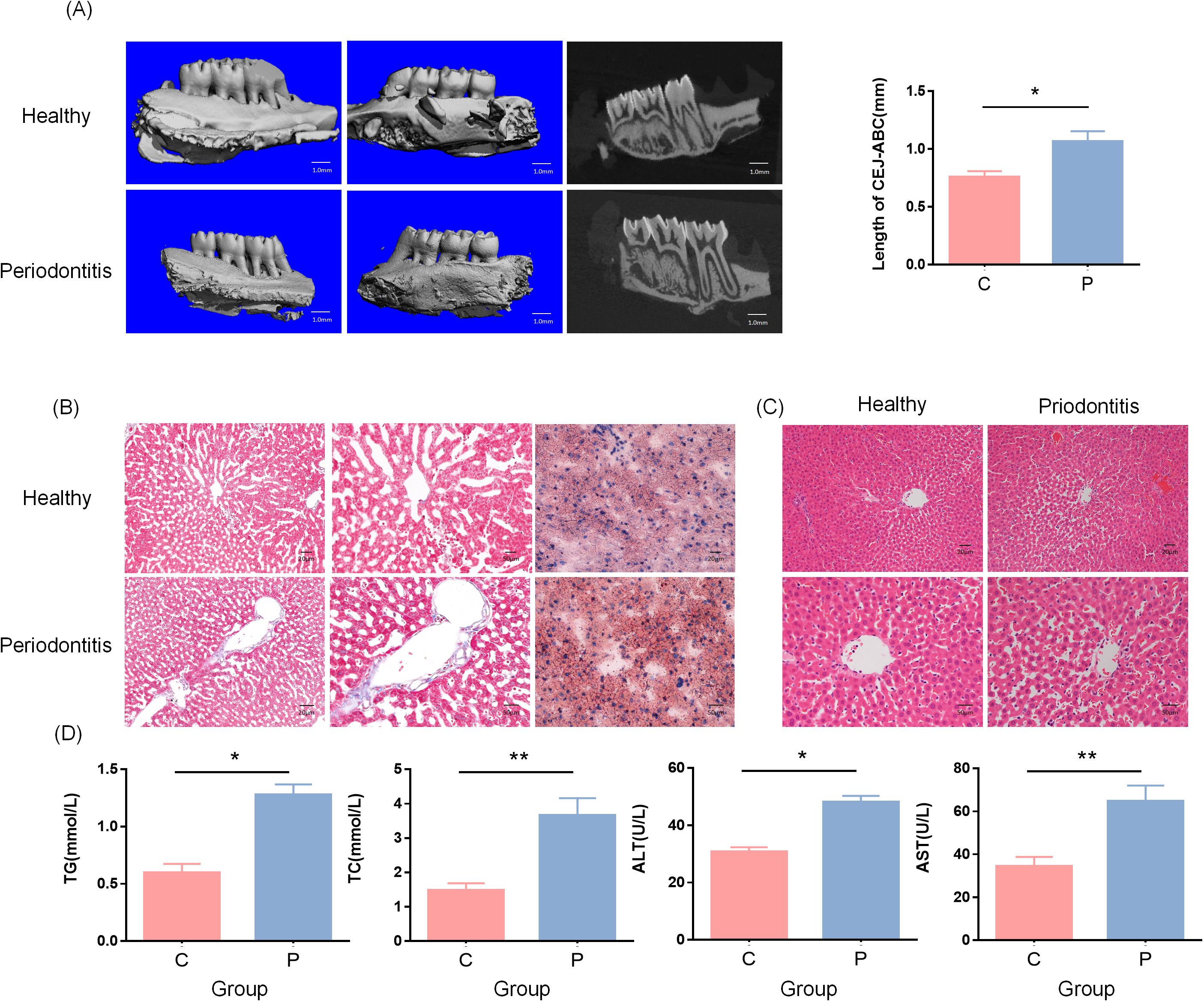 Figure 1. Periodontitis exacerbates NAFLD progression. (A) Micro-CT analysis (Scale bar = 1.0 mm). The distance from the cementoenamel junction (CEJ) to the alveolar crest was measured and presented as mean ± standard deviation. *p < 0.05. (B) Compared to the control group, the periodontitis group showed significant increases in serum TG, TC, ALT, and AST. *p < 0.05, **p < 0.005. (C) Oil Red O and Masson staining. The periodontitis group exhibited increased hepatic lipid droplet accumulation and fibrosis compared to the control group. (D) HE staining. Hepatic tissue from the periodontitis group showed disrupted hepatic cord arrangement and lipid droplet accumulation compared to controls. Yellow arrows indicate lipid droplets. C represents the control group, and P represents the periodontitis group.