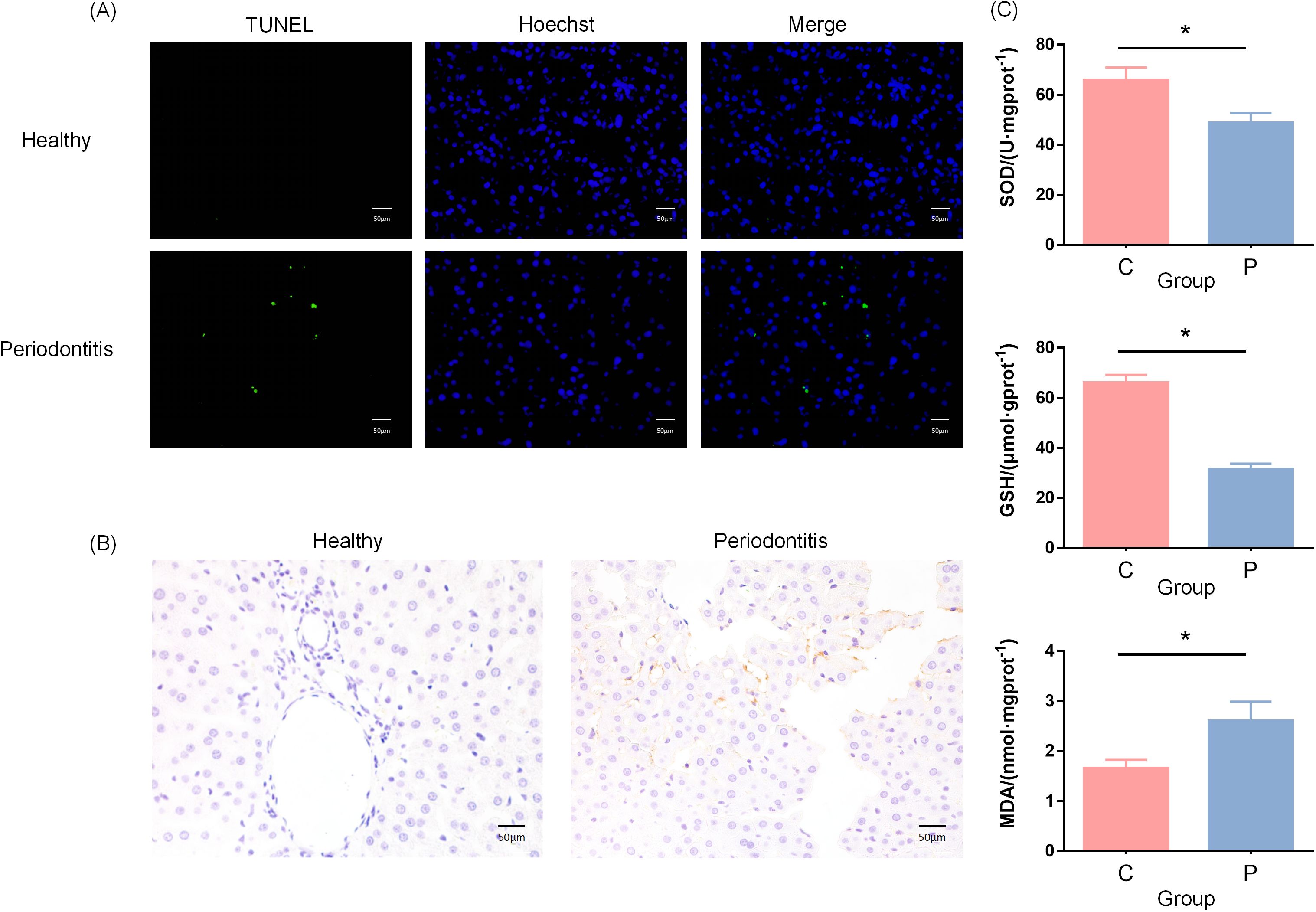 Figure 2. Oxidative stress in the liver of periodontitis-induced rats. (A) Representative images showing TUNEL-positive apoptotic cells (green) and Hoechst (blue) staining in hepatic tissues of periodontitis mice and healthy mice. The merged images illustrate the co-localization of apoptotic cells and nuclei. (B) Immunohistochemistry staining showed significant NF-kB activation in hepatocytes of periodontitis-induced rats. (C) Serum analysis revealed decreased GSH and SOD levels and elevated MDA levels, indicating enhanced oxidative stress. *p < 0.05.