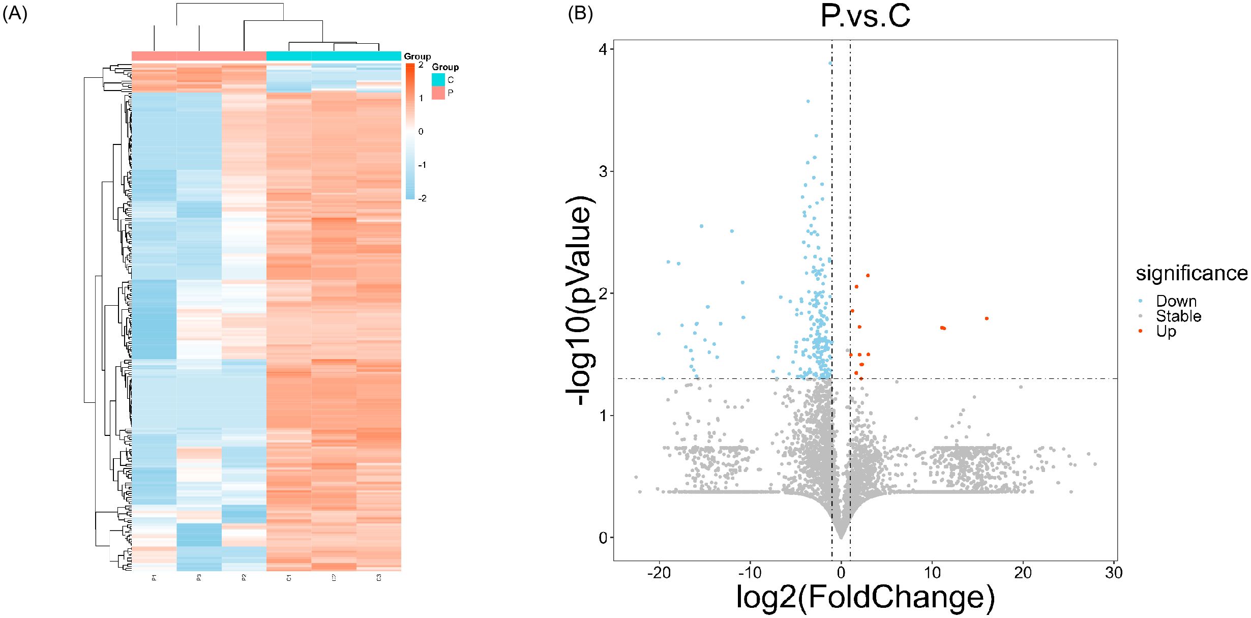 Figure 3. Significant differences in proteomic characterization between normal and PD rats. (A) The clustering of differentially expressed proteins is represented by the heat map. Each column represents a sample, and different groups are distinguished by long bars of different colors, with the normal rats (C group) represented by blue and the periodontitis-induced rats (P group) by orange; each row represents a differential protein; and the relative content of differential proteins is indicated by differences in color. (B) Volcano plot was drawn using two factors, the fold change (FC) of protein expression differences between the gingival tissue of young mice and old mice and the p-value together. Blue circles on the left side of the graph represent the down-regulation of expression, and orange circles on the right side represent the up-regulation of expression (FC ≥ 1.2, p ≤ 0.05).