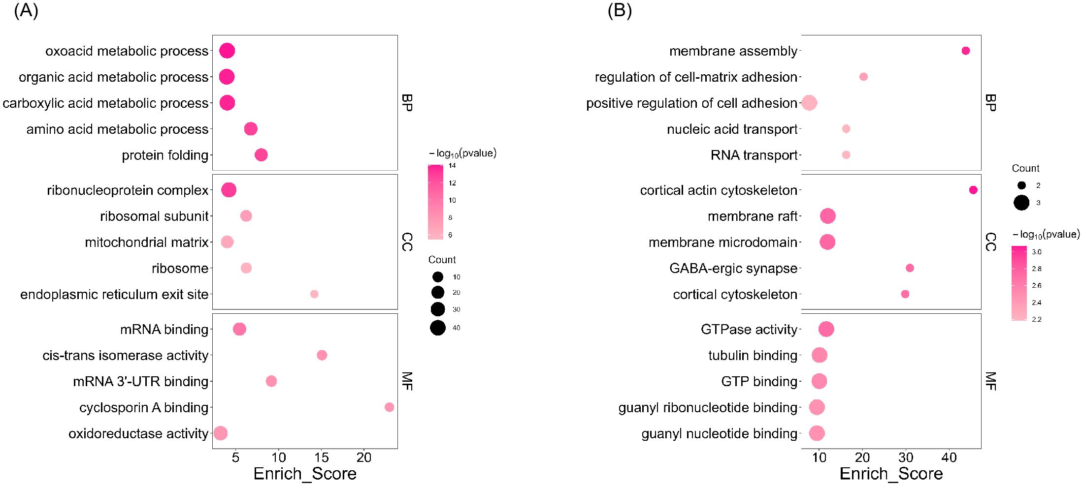 Figure 4. Gene ontology (GO) enrichment analysis based on DEPs. (A) The top 10 most enriched GO terms in biological process (BP), cellular component (CC), and molecular function (MF) for downregulated proteins in the liver of periodontitis-induced rats. (B) The top 10 most enriched GO terms in BP, CC, and MF for upregulated proteins in the gingival tissue of periodontitis-induced rats. Dot size corresponds to the number of enriched proteins (Count), color intensity represents the statistical significance as measured by -log10(p-value), and the x-axis indicates the enrichment score.