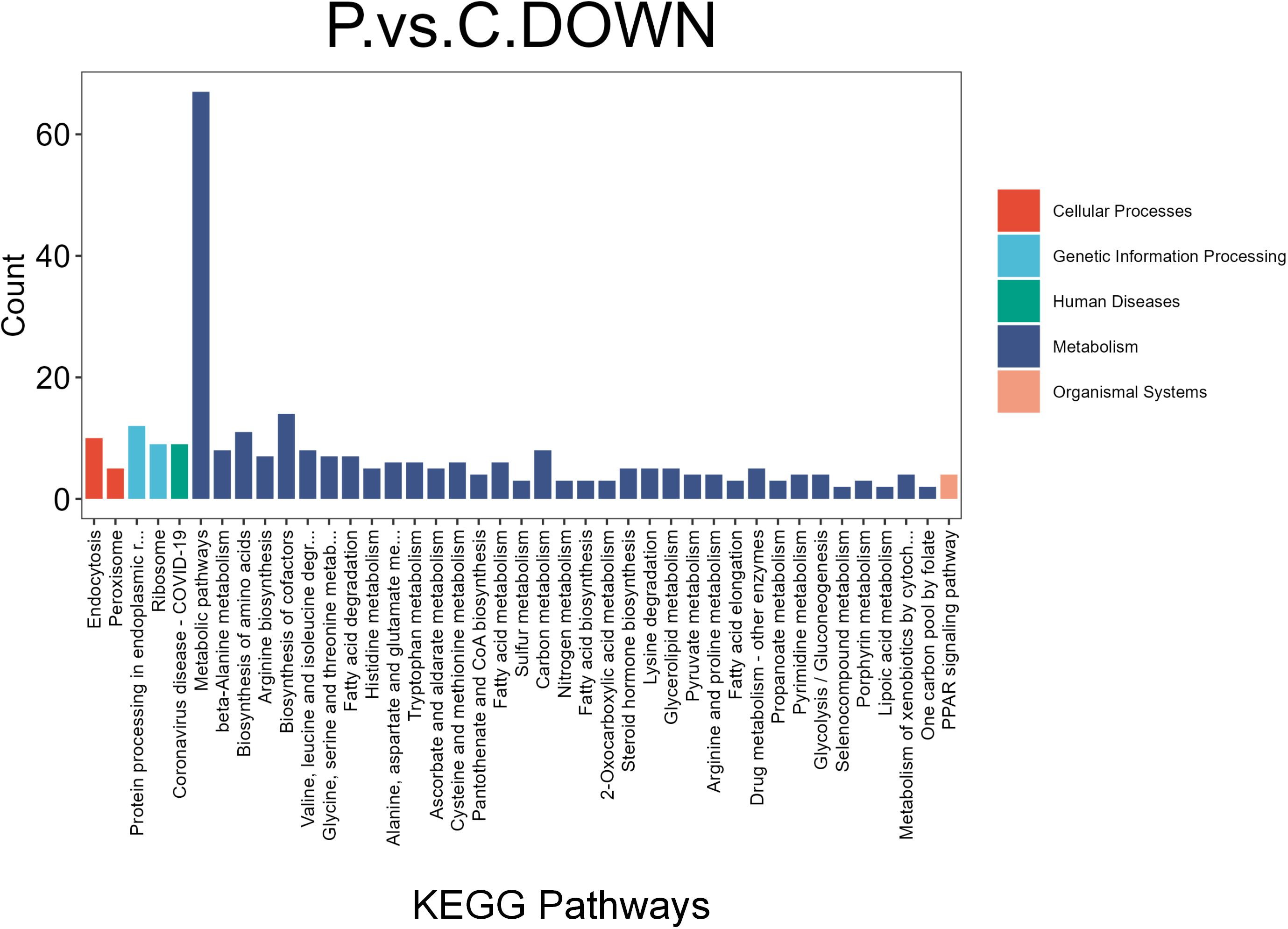 Figure 5. Kyoto encyclopedia of genes and genomes (KEGG) enrichment analysis based on down regulated DEPs. Bar plot of KEGG enrichment analysis outcomes. The DEPs are primarily enriched in metabolism-related pathways.