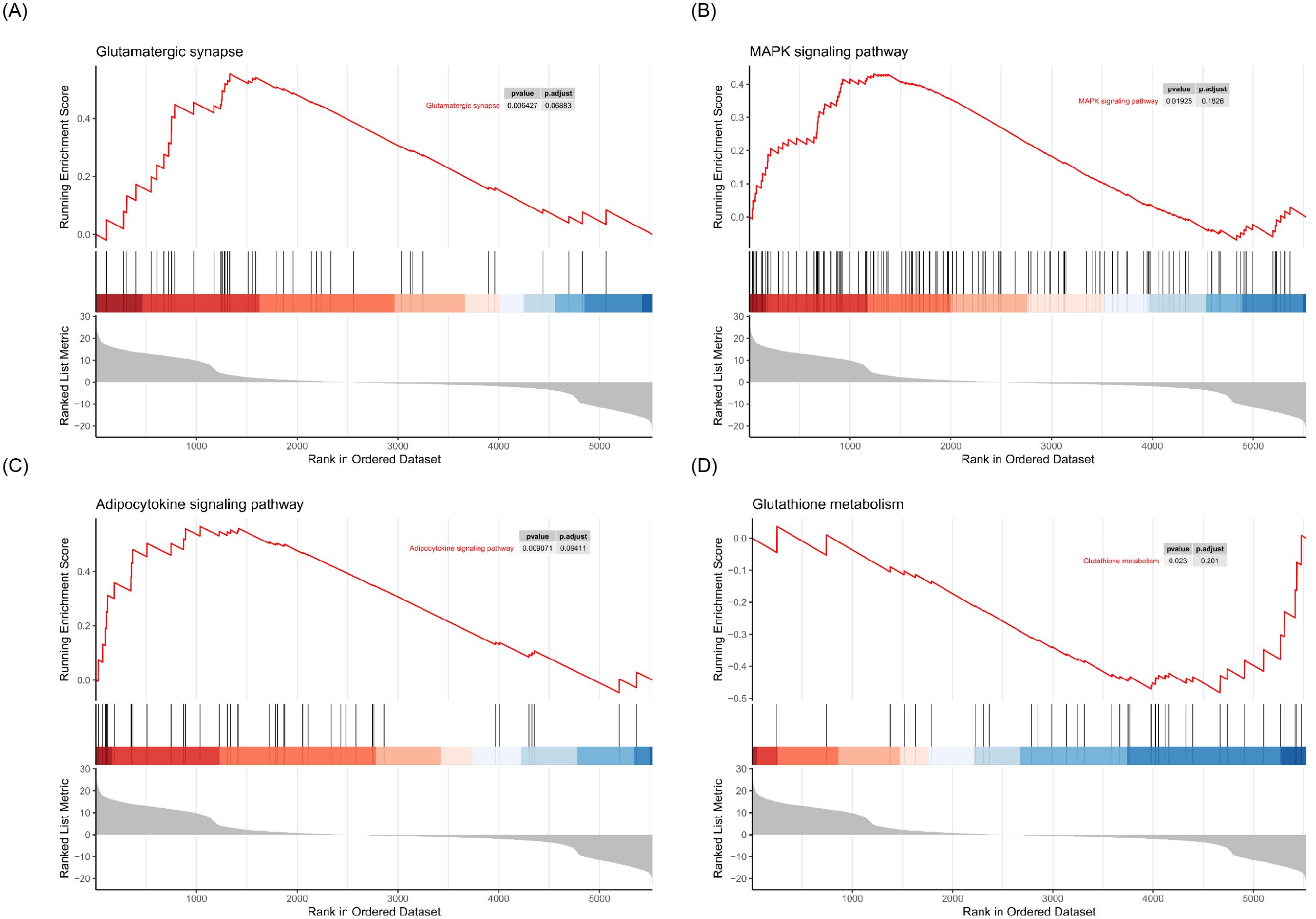 Figure 6. Gene set enrichment analysis (GSEA). (A) GSEA results for the Glutamatergic synapse pathway. (B) GSEA results for the MAPK signaling pathway. (C) GSEA results for the Adipocytokine signaling pathway. (D) GSEA results for Glutathione metabolism.