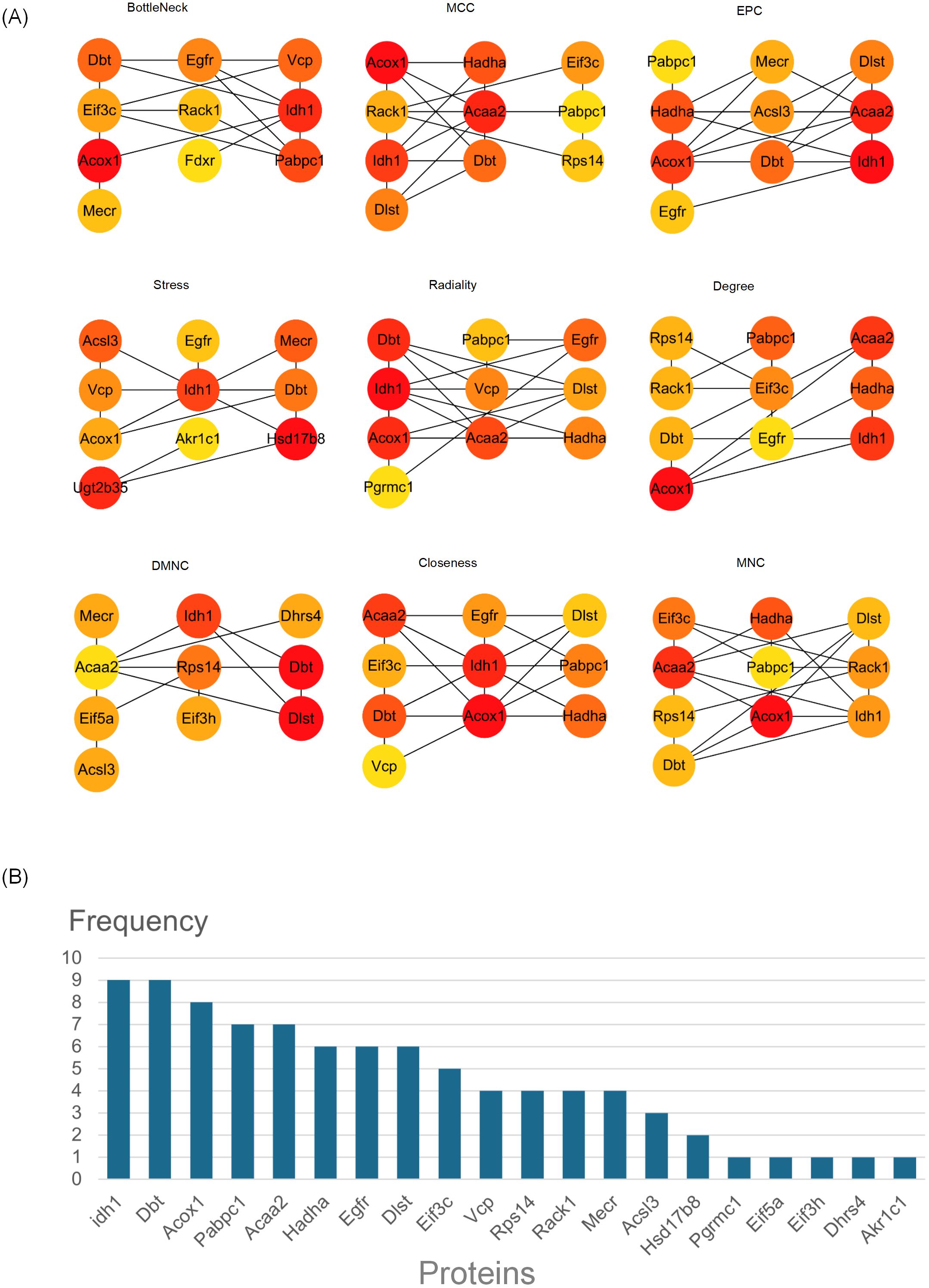 Figure 7. PPI network identified hub proteins. (A) Top 10 hub proteins identified using the cytoHubba plugin in Cytoscape, based on nine different algorithms, BottleNeck, MCC, EPC, Stress, Radiality, Degree, DMNC, Closeness and MNC. (B) Frequency of hub proteins occurrence across the nine algorithms.