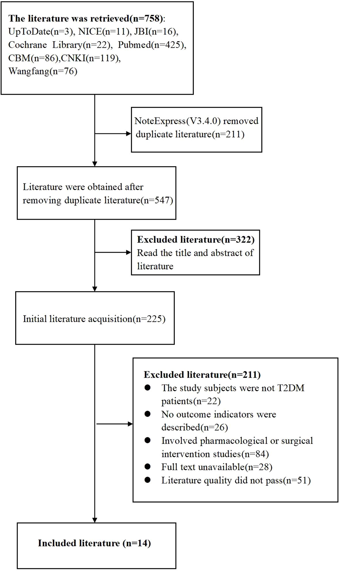 This study retrieved a total of 758 literature items, comprising 281 articles in Chinese and 477 articles in English. After importing into NoteExpress (V3.4.0) and removal of duplicates, 547 articles remained. Two team members independently read the title and abstract of each article. After this step, 225 articles remained. Further reading of the full text and removal of 211 articles that did not meet the inclusion criteria of this study resulted in 14 articles included in the final analysis (Figure 2). Following this selection process, 14 studies were included, comprising 13 guidelines and one systematic review.