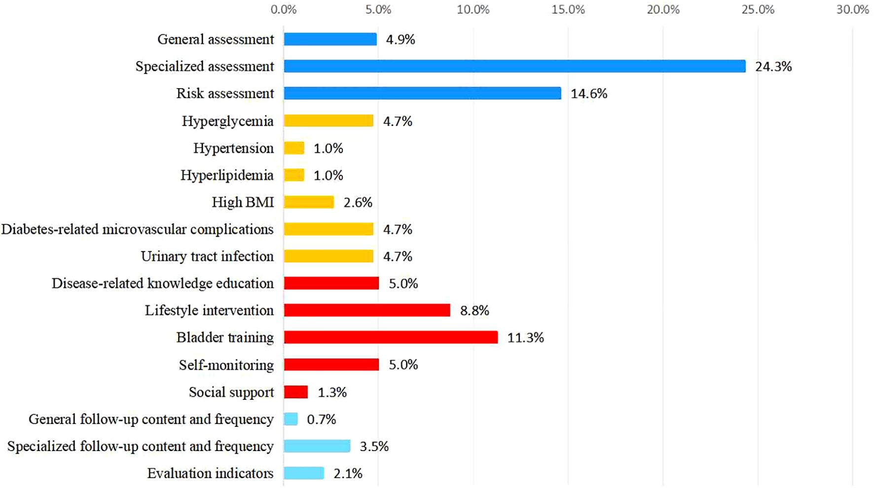 In the tertiary indicators, some experts highlighted that the description of “1.1.1 Endocrinologists evaluate the patient’s medical history, physical examination, auxiliary examination findings, and medication use” was vague and lacked practical applicability, recommending further refinement. Additionally, the experts proposed incorporating “complication screening” into “1.1 General assessment.” For “1.2 Specialist assessment,” it was suggested to include evaluations of “urinary system management” and physical examinations of the “urogenital system and nervous system.”