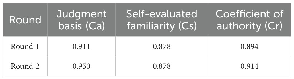 Data entry and analysis were performed using Excel 2019 (Microsoft Corp.) and SPSS 26.0 (IBM Corp.), respectively. Response rates were calculated to evaluate the experts’ positive attitudes toward the research, defined as the ratio of returned questionnaires to distributed questionnaires. A response rate exceeding 70% was considered indicative of effective consultation (34). Expert authority on the topic was assessed by calculating the composite reliability (Cr), derived from the mean values of self-evaluated familiarity (Cs) and judgment basis (Ca) coefficients. A composite reliability (Cr) value ≥0.7 was deemed to indicate reliable expert authority (35). Consistency was evaluated using the coefficient of variation (CV) and Kendall’s coefficient of concordance (W) (11, 36, 37). Retention criteria for indicators included a CV <0.25, a mean importance score >4.00, and a full score ratio >20% (38). Indicators failing to meet these thresholds were modified or excluded based on feedback from consulting experts or internal discussions.