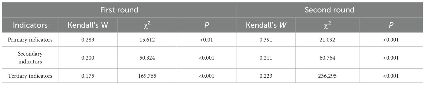 In the subsequent round of consultation, the values for self-evaluated familiarity (Cs), judgment basis (Ca), and Cr were updated to 0.878, 0.950, and 0.914, respectively (Table 2). The CV for the indicators in this round ranged from 0 to 0.212, suggesting a change in the consistency of the responses. The Kendall’s W values for the primary, secondary, and tertiary indicators in this round were recorded as 0.391(p<0.001), 0.211(p <0.001), and 0.223(p<0.001), respectively. The improvement in the Kendall’s W value for primary indicators from 0.289 in Round 1 to 0.391 in Round 2 indicates a significant enhancement in consensus among experts. However, it is important to note that with a W value of 0.211 and 0.223 for secondary and tertiary indicators, respectively, the level of expert agreement remains classified as weak (41, 42). Despite this weak consensus, the findings are statistically significant. These results are detailed in Table 3.