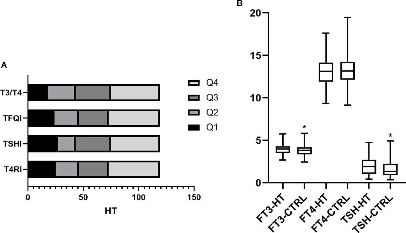 Figure 1. Levels and sensitivity of thyroid hormones in HT. (A) Indicators of thyroid hormone sensitivity were divided into four groups according to quartiles. The frequency of HT within each group is shown. The results show that HT in Q4 was significantly higher than in the other three groups. This indicates that even with normal thyroid function, HT has impaired thyroid hormone sensitivity, both centrally and peripherally. (B) Based on the diagnosis of HT, patients were divided into the HT and control (CTRL) groups. Comparing thyroid function between groups, FT3 and TSH were higher in the HT group than in the CTRL group, whereas no difference was found in FT4. p <0.05 was considered statistically different and marked with *.