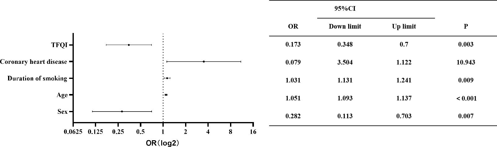 Patients were categorized by the presence or absence of carotid plaque to compare risk factors. Univariate analysis identified significant factors, including sex, age, smoking duration, DM, coronary heart disease, ischemic stroke, T4RI, and T3/T4. Multifactorial analysis using logistic regression indicated that after accounting for interactions, independent risk factors for carotid plaque included sex, age, coronary artery disease, and TFQI. The odds ratio (OR) assessed relative risk, with factors having an OR greater than 1 as risk factors, while those less than 1 indicated protective effects. As shown in Figure 2, men, older individuals, and those with higher central thyroid sensitivity and a history of coronary artery disease are at increased risk for carotid plaque. Importantly, hypertension was not found to directly influence carotid plaque risk.