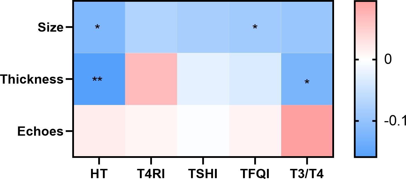 Figure 3. Contribution of HT and thyroid hormone sensitivity to carotid plaque properties. There was a difference in plaque size between the HT and non-HT groups. With TFQI quartile grouping, there were differences in plaque size between groups; T3/T4 and HT differed between the group with a plaque thickness <2 mm and the group with a plaque thickness greater than or equal to 2 mm. Color indicates correlation coefficient. p <0.05 indicates a statistical difference. *p < 0.05, **p < 0.01.