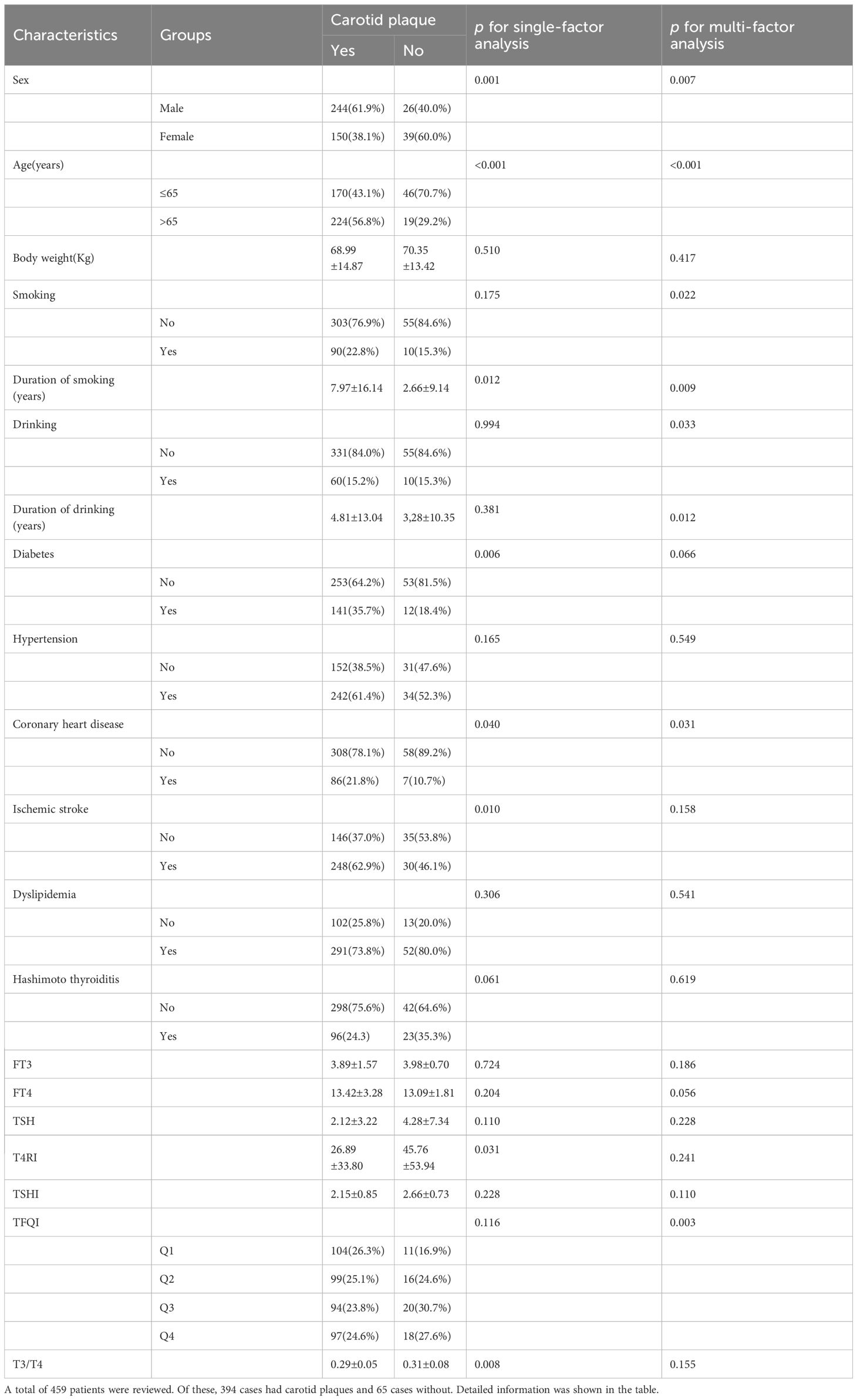 A total of 459 patients were reviewed. Of these, 394 cases had carotid plaques and 65 cases had no detectable plaques. Detailed information is shown in the table.