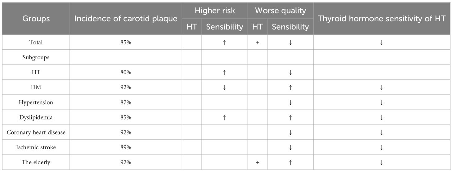 Conclusion: In euthyroid individuals, HT impairs thyroid hormone sensitivity. Increased thyroid hormone sensitivity (as reflected by higher sensitivity indices) elevates carotid plaque risk. While HT may exert a modest protective effect against plaque formation, it contributes to the deterioration of plaque quality in patients with diabetes mellitus and dyslipidemia and elderly individuals with increased thyroid hormone sensitivity.