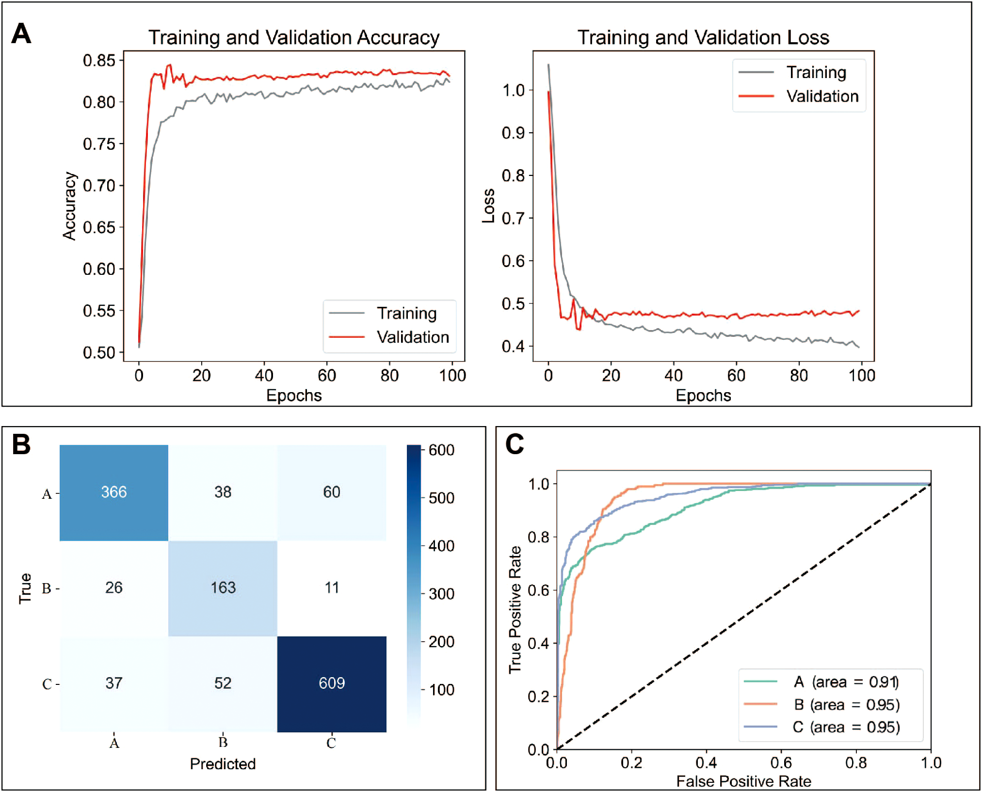 A total of 12 models were used for training and predicting. The accuracy, sensitivity, and specificity for each model were presented in Table 2. Among these, the MLP model had the best predictive performance (Table 2). Training and validation accuracy, as well as training and validation loss, reflect the model’s performance on the training and validation datasets (42). Our results showed that the MLP model performed well in both the training and prediction datasets (Figure 5A). The prediction results for Raman spectra in the test dataset using the MLP model were shown in Figure 5B. The sensitivity for predicting A was 0.79, for predicting B was 0.82, and for predicting C was 0.87, while the specificity for predicting A was 0.93, for predicting B was 0.92, and for predicting C was 0.89. The ROC curve for predicting A, B, and C was shown in Figure 4C. The AUC for A was 0.91, and for B and C, it was 0.95 (Figure 5C).