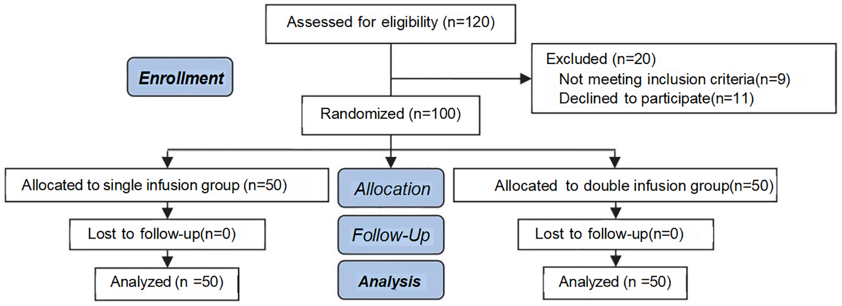 This study is a single-blinded, randomized controlled trial conducted at the Reproductive Center of Yulin Maternal and Child Health Hospital from July 2023 to February 2025. A total of 120 patients with thin endometrium were screened, and 100 subjects who met strict inclusion and exclusion criteria were ultimately enrolled (reasons for exclusion: 9 did not meet the inclusion criteria and 11 declined participation). No subjects were lost to follow-up during the study period (see Figure 1). A computer-generated randomization sequence was produced using the Chinese Clinical Trial Registry system, and central randomization allocated participants in a 1:1 ratio to either the single infusion group (n=50) or the double infusion group (n=50).