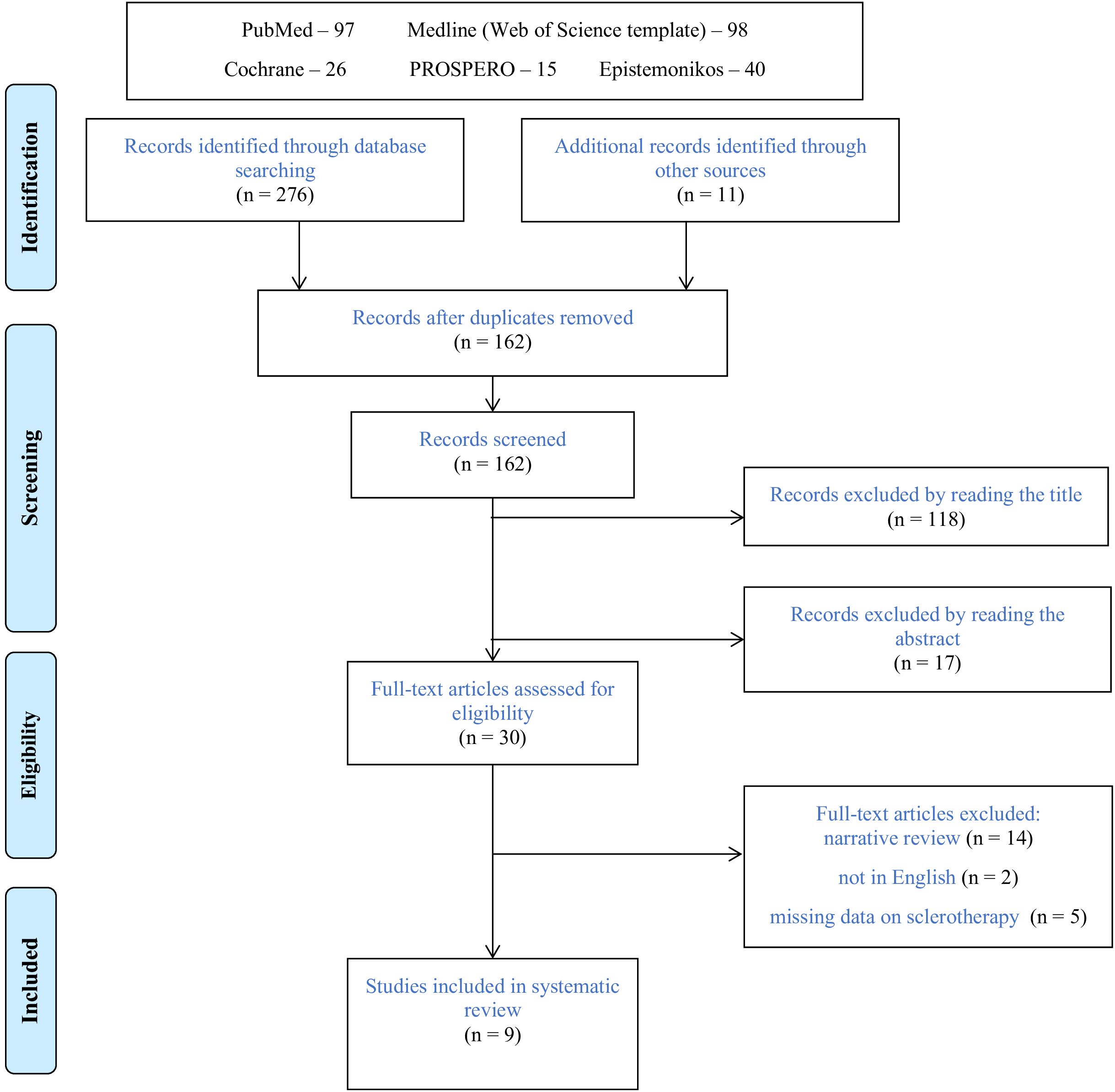 Database and manual searching identified two hundred seventy-six manuscripts (Figure 1). Following exclusions of duplicates and elimination of publications by reading the title and abstract, thirty reviews were qualified for full-text assessment. Among these publications, twenty-one were excluded from the final evaluation; fourteen were narrative reviews (25–38), five did not discuss sclerotherapy (39–43), and two were not in English (44, 45). The remaining nine systematic reviews were eligible for final analysis (14, 15, 46–52).