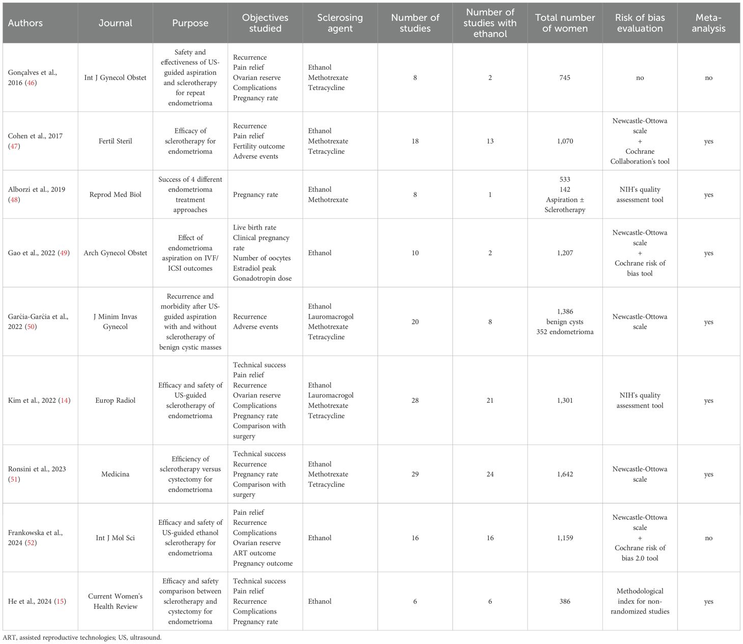 Additionally, all but one systematic review evaluated only women with endometrioma, while another review evaluated other benign pelvic cystic masses, including simple cysts, hydrosalpinx, and other lesions, in addition to endometrioma (50). Furthermore, all systematic reviews evaluated endometrioma aspiration and sclerotherapy; seven compared sclerotherapy with surgery (14, 15, 47–49, 51, 52), and one evaluated other endometrioma management modalities (48).