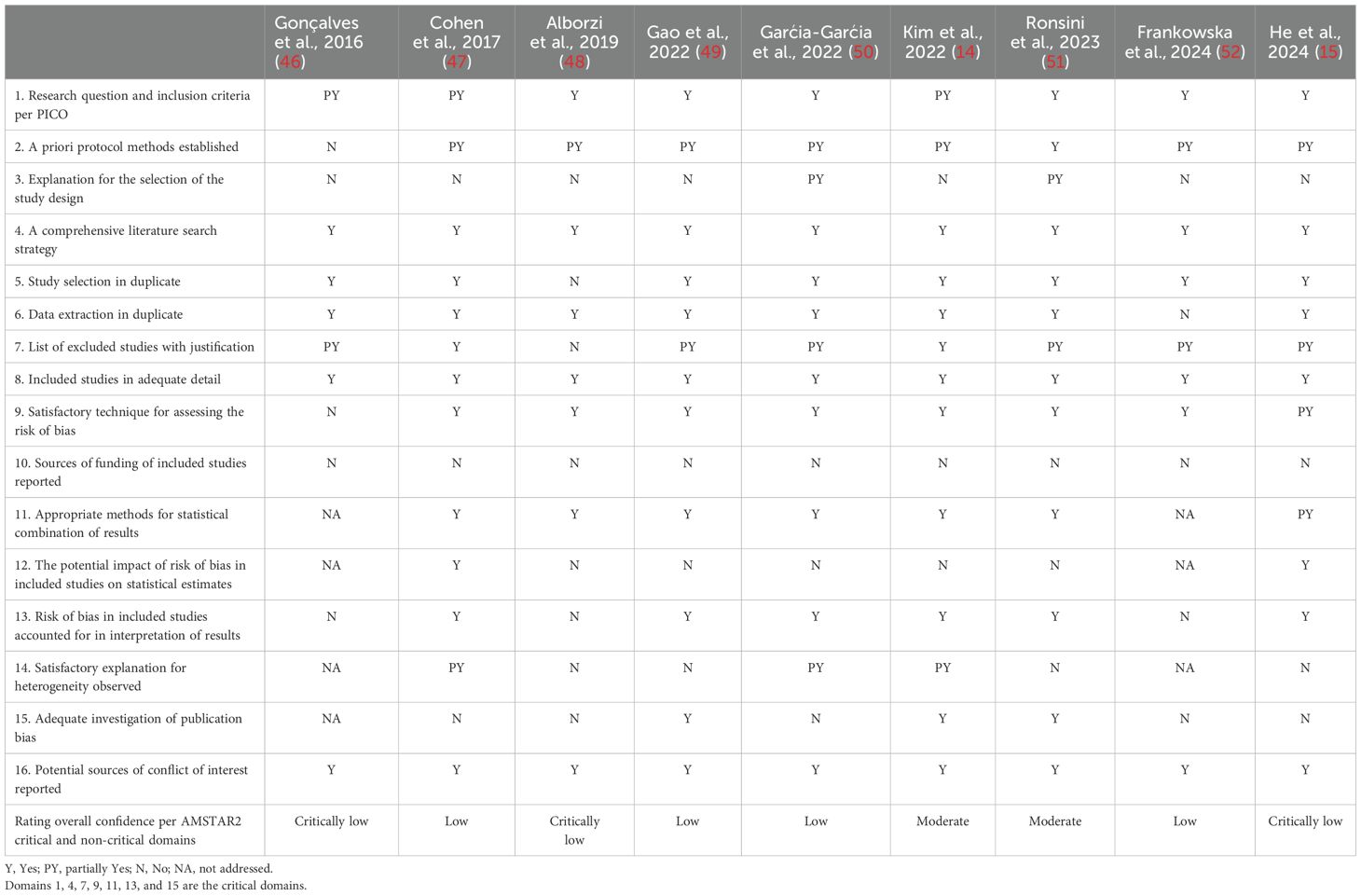 The evaluation of eligible systematic reviews was conducted using the sixteen domains of AMSTAR2. Each domain was categorized as “yes,” “partial yes,” or “no” based on whether it was fully implemented (and documented), partially applied, or not implemented, respectively, in each systematic review. Based on the critical and non-critical domains defined by AMSTAR2, the overall evidence was rated as high, moderate, low, or critically low (17).