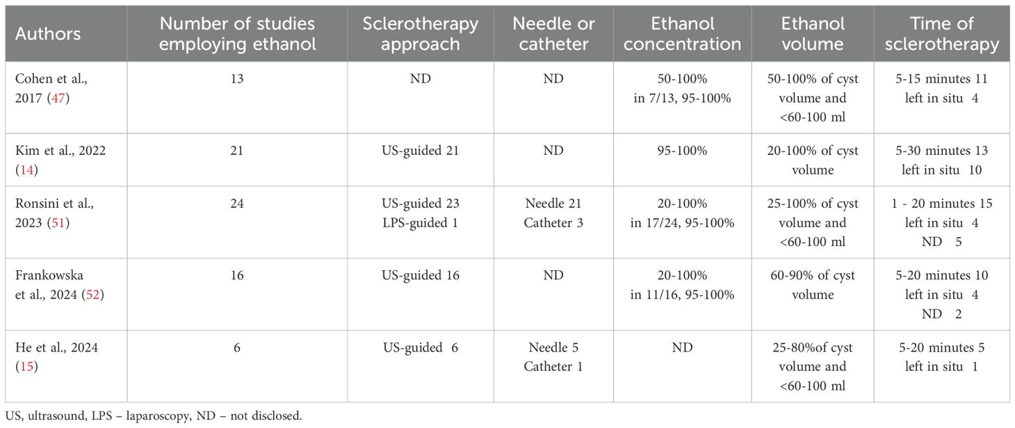 36. Şükür YE, Aslan B, Varlı B, Özcan P, Daniilidis A, and Kalaitzopoulos DR. Ethanol sclerotherapy for endometriomas in infertile women: A narrative review. J Clin Med. (2024) 13:7548. doi: 10.3390/jcm13247548