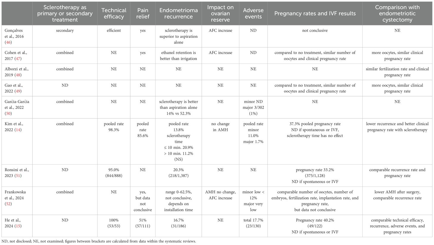 We have created a second descriptive table that inclusively summarizes the results of the outcome measures of all eligible reviews. We collected pooled estimates of the outcome measures from the systematic reviews and meta-analyses and organized them into the table. The remaining results were either calculated or summarized from the data within the systematic reviews. Additionally, we included a comparison of sclerotherapy and endometriotic cystectomy.
