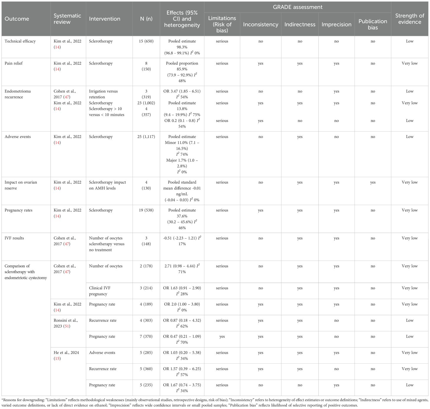 Table 5. GRADE strength of evidence score for significant outcomes reported in the overview of systematic reviews assessing ethanol sclerotherapy for endometrioma management in the reproductive age*.