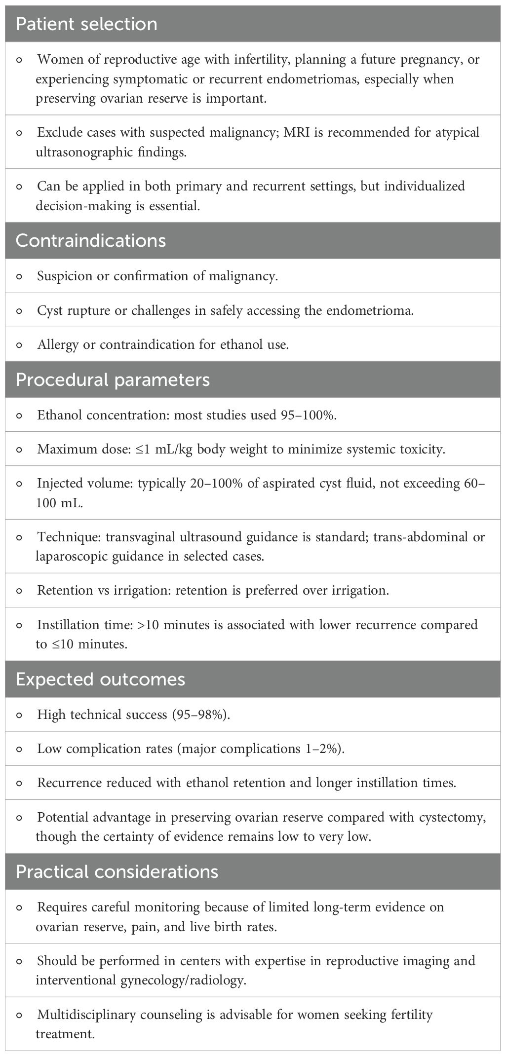 Ethanol sclerotherapy has its limitations. It cannot be performed when an endometrioma ruptures during the procedure or when there is a risk of malignancy. However, the occurrence of endometrioma rupture and the risk of malignant transformation are both uncommon and sporadic. Among women with gonadal endometriosis-associated ovarian cancer, only 0.028% are under the age of 40, with a calculated risk of 3 to 1000 (74). Utilizing magnetic resonance imaging (MRI) for atypical endometriomas diagnosed by trans-vaginal ultrasound prior to sclerotherapy may aid in distinguishing between benign endometriomas and malignant transformations (75). Furthermore, when other subtypes of endometriosis, such as superficial, deep infiltrating, or adenomyosis, are present, a comprehensive multidisciplinary evaluation is recommended to determine optimal management and treatment planning.