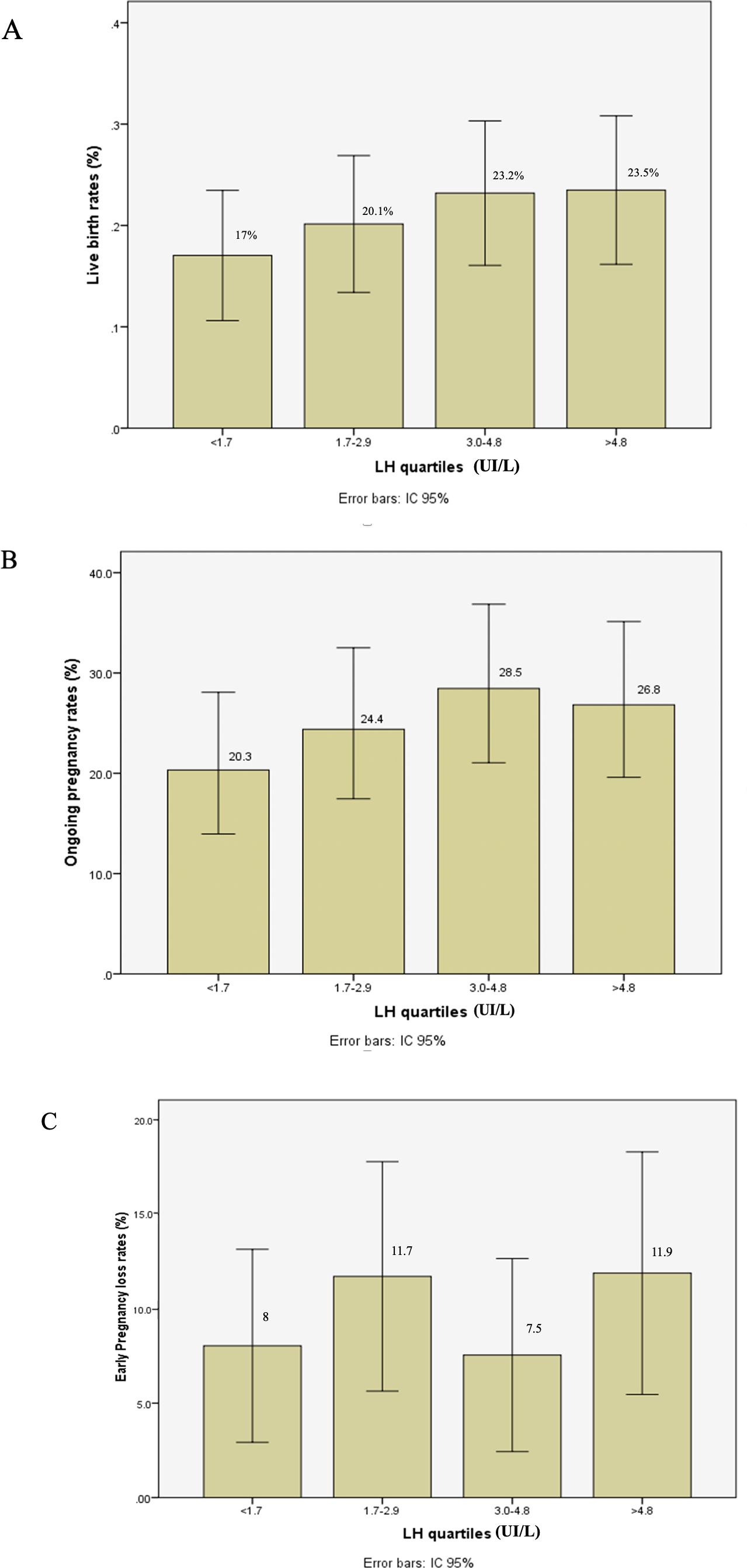 Figure 1. Live birth rate (A), ongoing pregnancy rate (B), and early pregnancy loss rate (C) after fresh embryo transfer according to LH levels in late follicular phase during GnRH antagonist protocol.