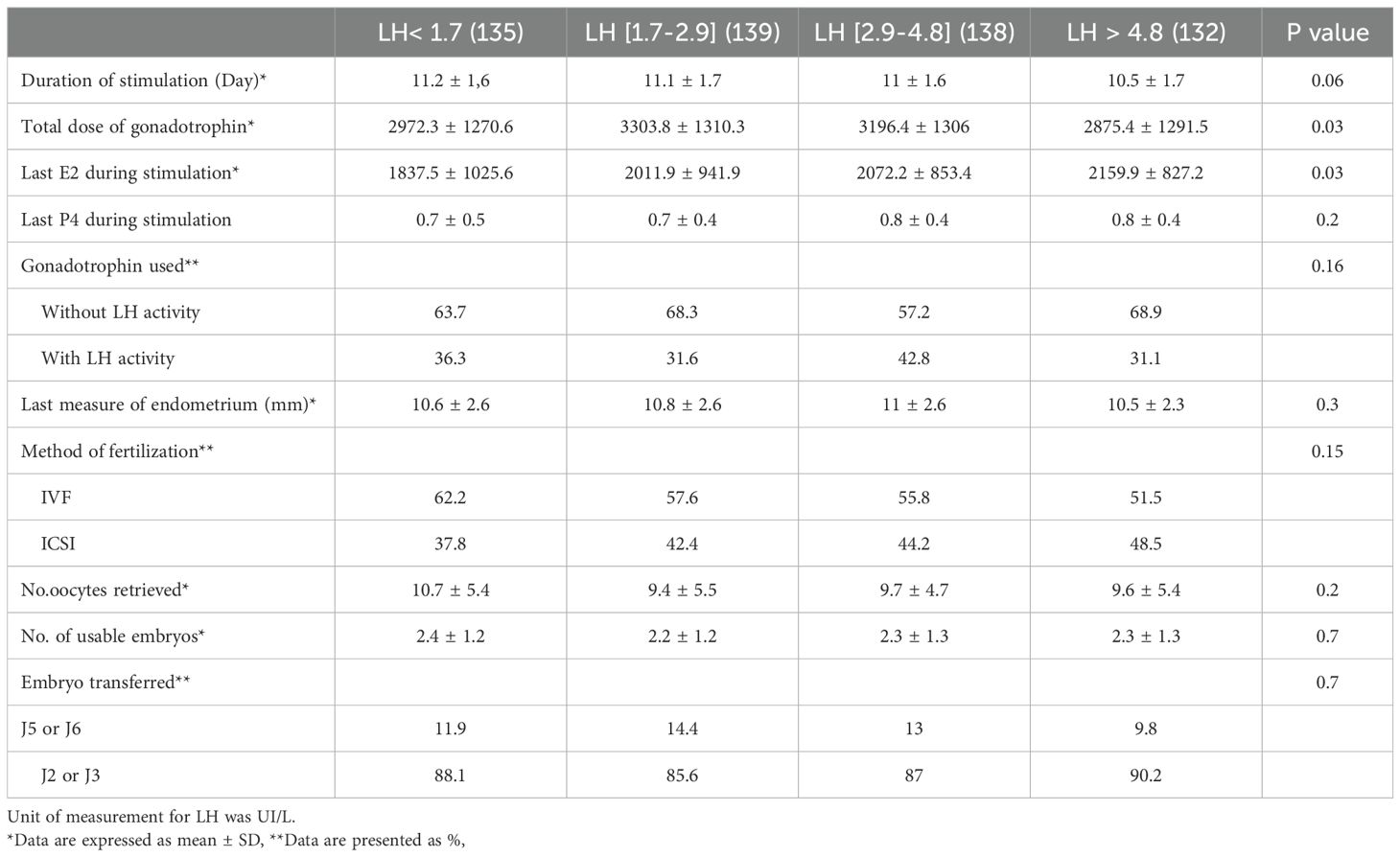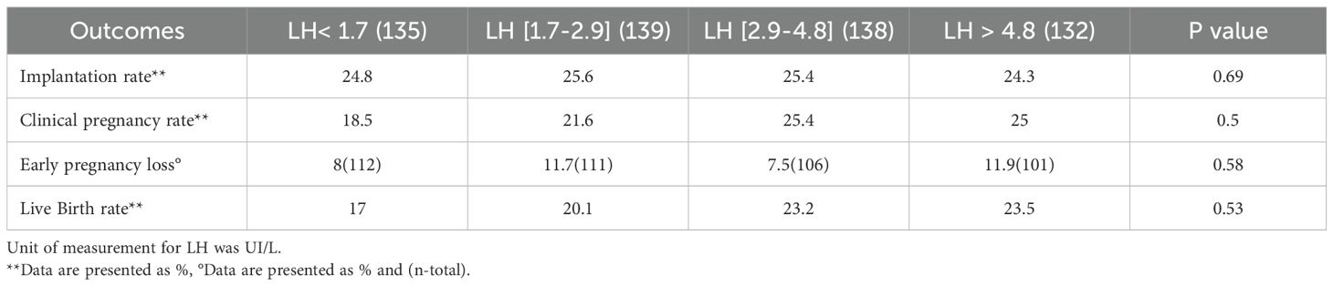 Exposure: Monocentric study involving 544 IVF cycles with the GnRH antagonist protocol. Four groups were stratified based on preovulatory LH levels: Q1: LH < 25th percentile, Q2: LH 25-50th percentile, Q3: LH 50-75th percentile, and Q4: LH > 75th percentile.
