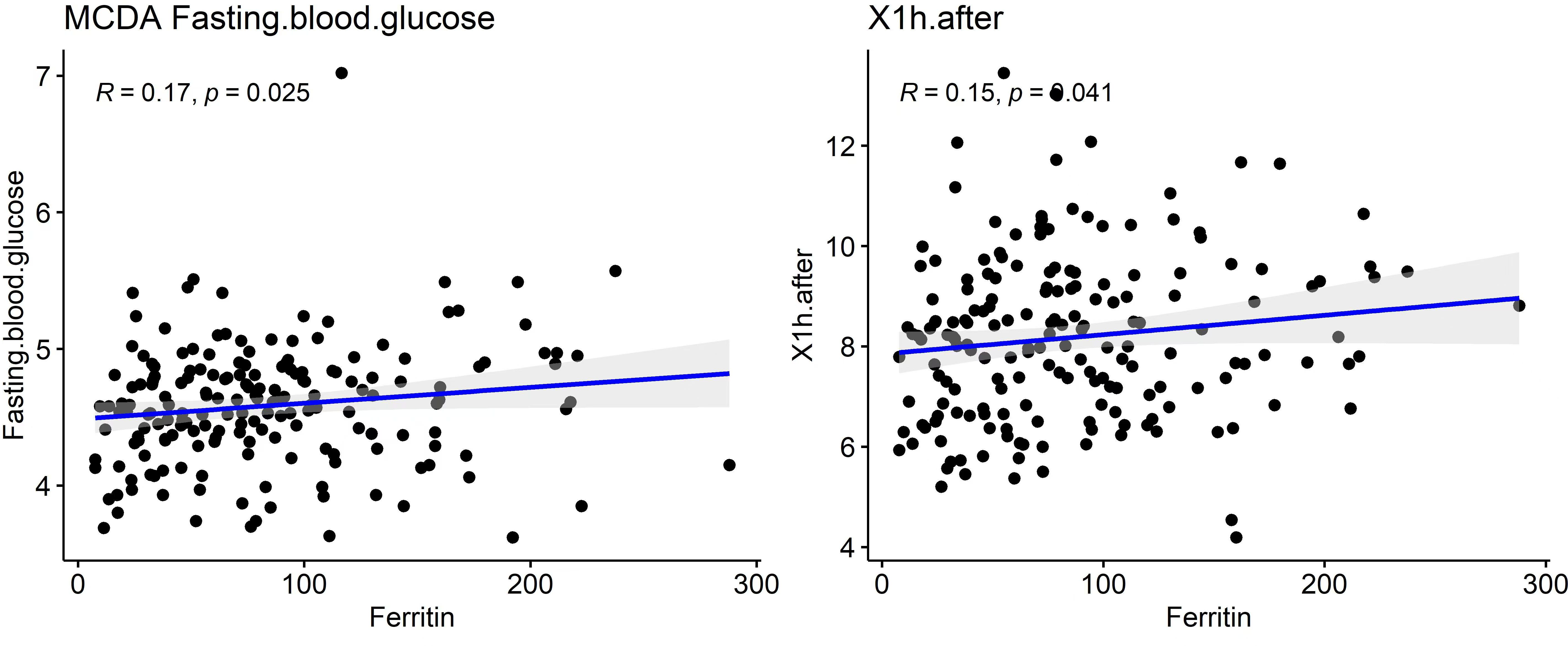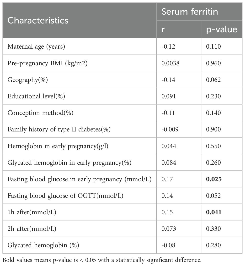 To further explore the metabolic significance of serum ferritin, correlation analysis was performed between early pregnancy SF and glucose-related indices. As shown in Table 6 and Figure 2, SF levels were positively correlated with fasting blood glucose in early pregnancy (r = 0.17, p = 0.025) and 1-hour OGTT glucose at 24–28 weeks (r = 0.15, p = 0.041).