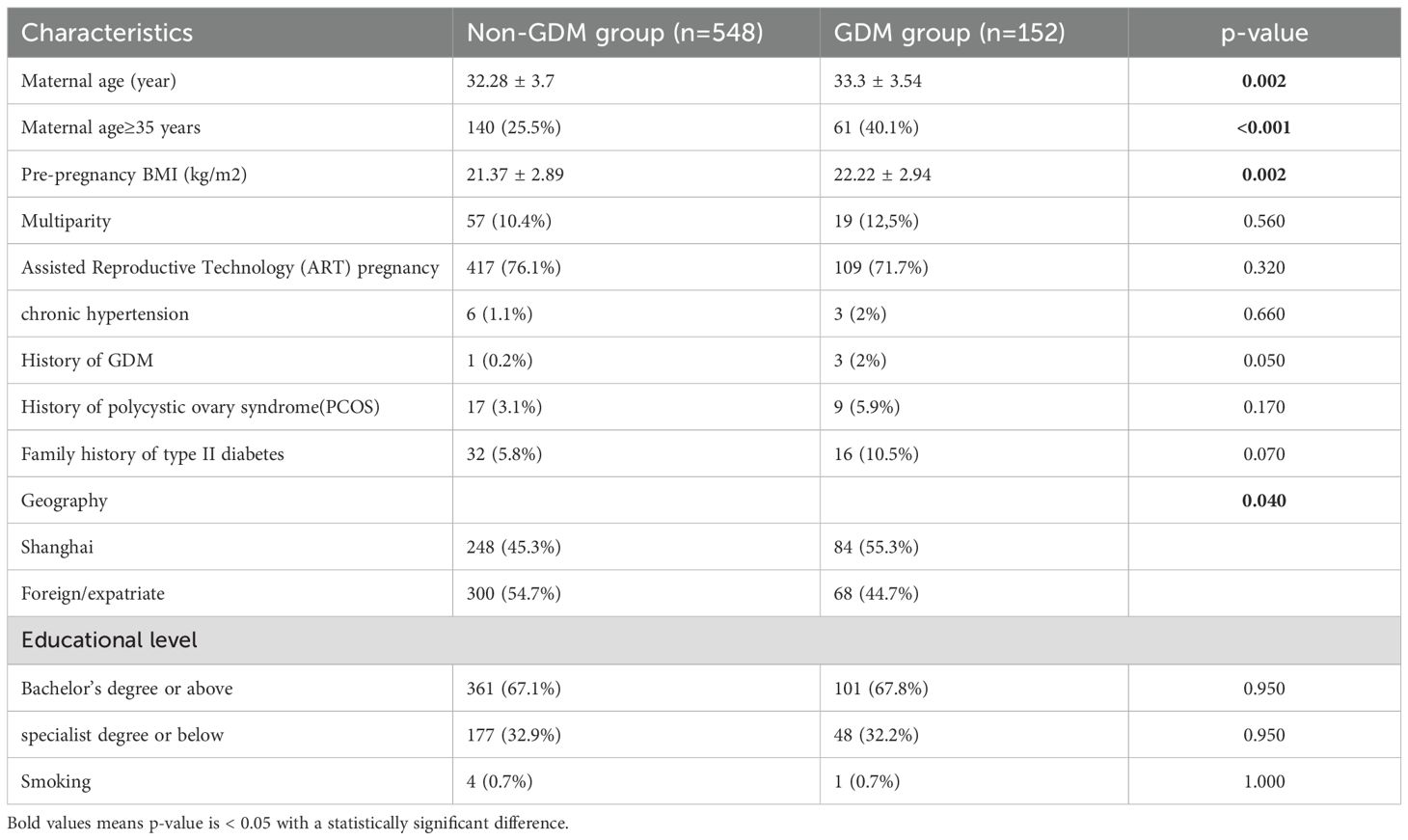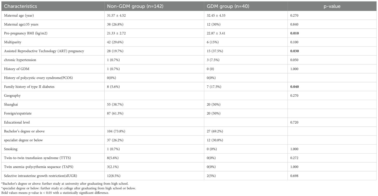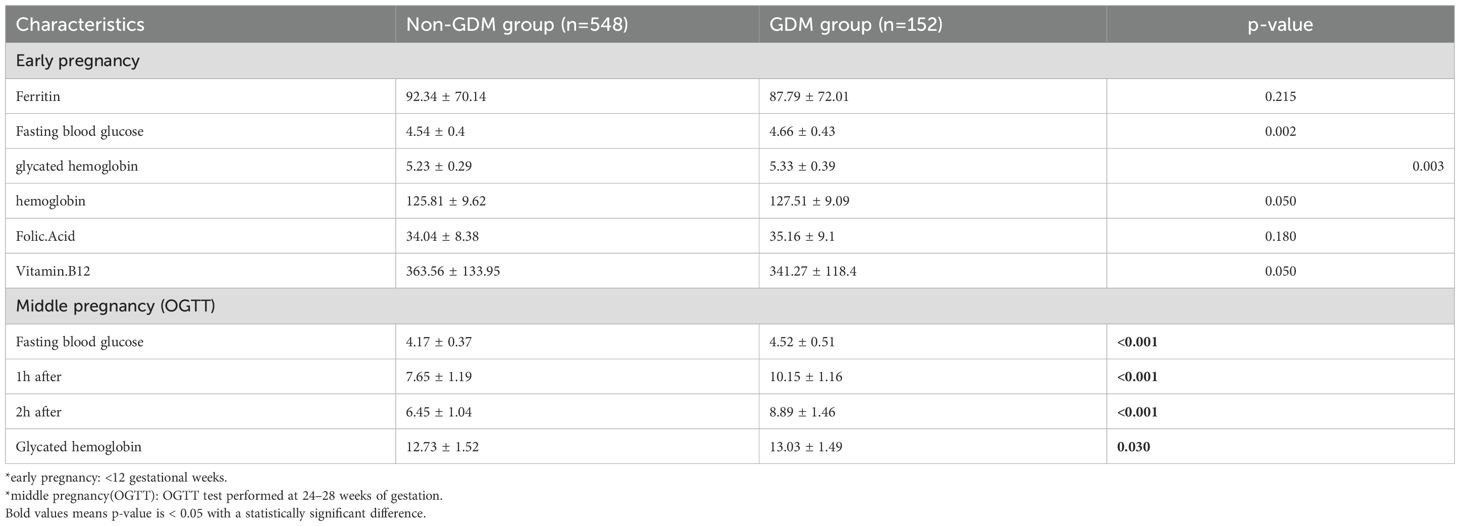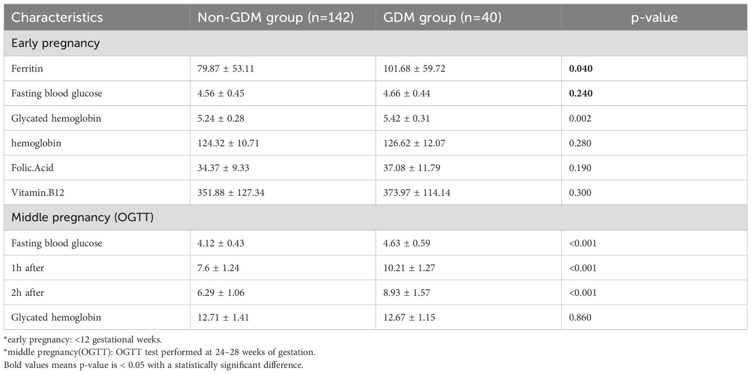 Continuous variables were summarized as means ± standard deviations (SDs), and categorical variables were reported as frequencies and percentages. Comparisons between the GDM and non-GDM groups were performed using independent samples t-tests for continuous variables and chi-square tests for categorical variables.