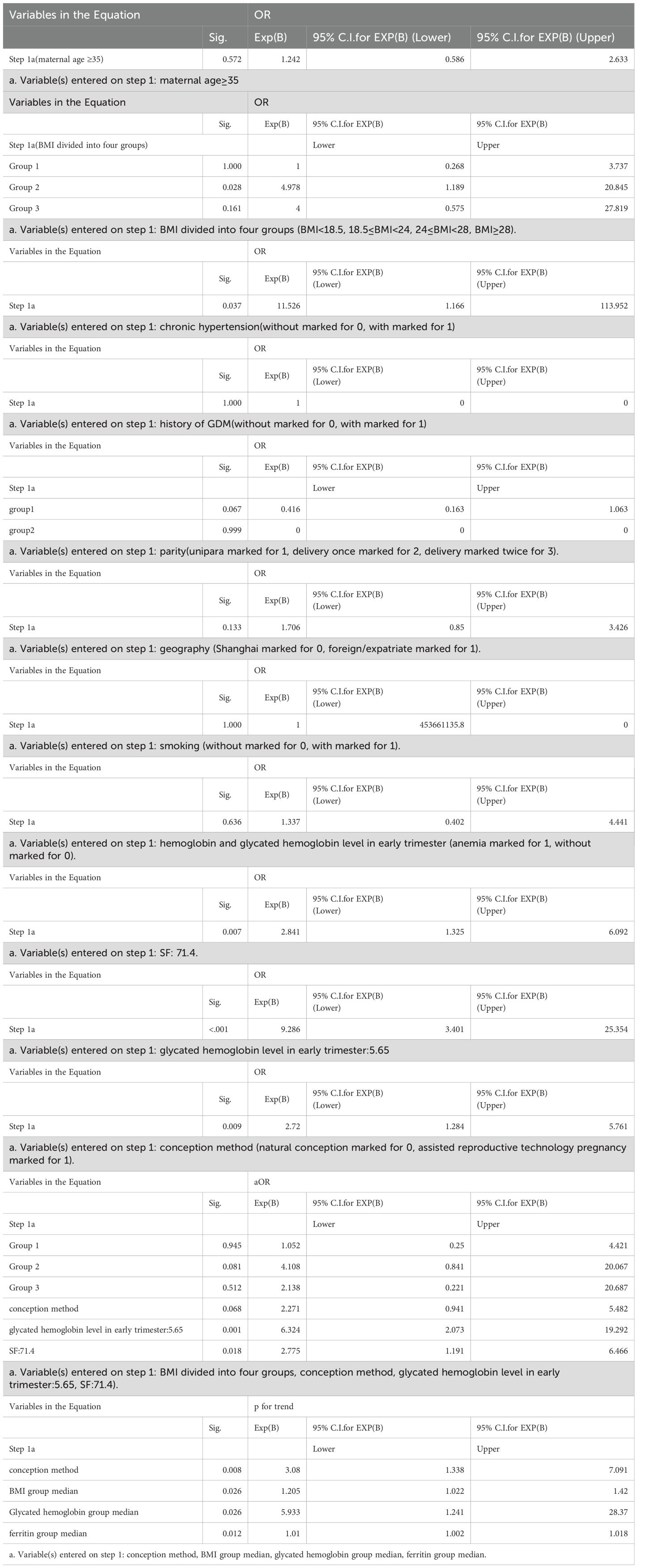 As shown in Table 5, after adjustment for potential confounders (maternal age, parity, history of GDM, family history of diabetes, pre-pregnancy BMI, ART pregnancy, chronic hypertension, smoking, early Hb and HbA1c), women with SF > 71.4 μg/L had a significantly increased risk of developing GDM compared to those with SF ≤ 71.4 μg/L (adjusted OR = 2.775; 95% CI: 1.191–6.466; p = 0.018). A dose-response trend was also observed across SF categories (p for trend = 0.012), supporting a potential threshold effect.