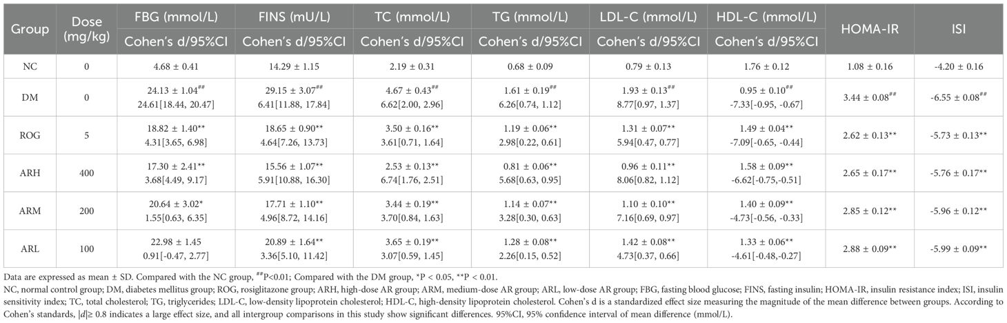 The DM model rats were randomly divided into five groups: the DM model group (DM, n=7), AR extract high-, medium- and low-dose groups (ARH, ARM, ARL, n=7 per group), and the rosiglitazone positive control group (ROG, n=7). The DM group and NC group received 0.8 mL/100g body weight of distilled water by oral gavage daily. The ROG group was administered 5 mg/kg body weight of rosiglitazone suspension daily, while the ARH, ARM, and ARL groups received 400, 200, and 100 mg/kg body weight of AR extract, respectively, once daily for four weeks. All experimental procedures were conducted in strict accordance with the Guidelines for the Care and Use of Laboratory Animals and were approved by the Institutional Animal Care and Use Committee of Guangdong Pharmaceutical University (Guangzhou, China; Approval no. gdpulacspf2018132).