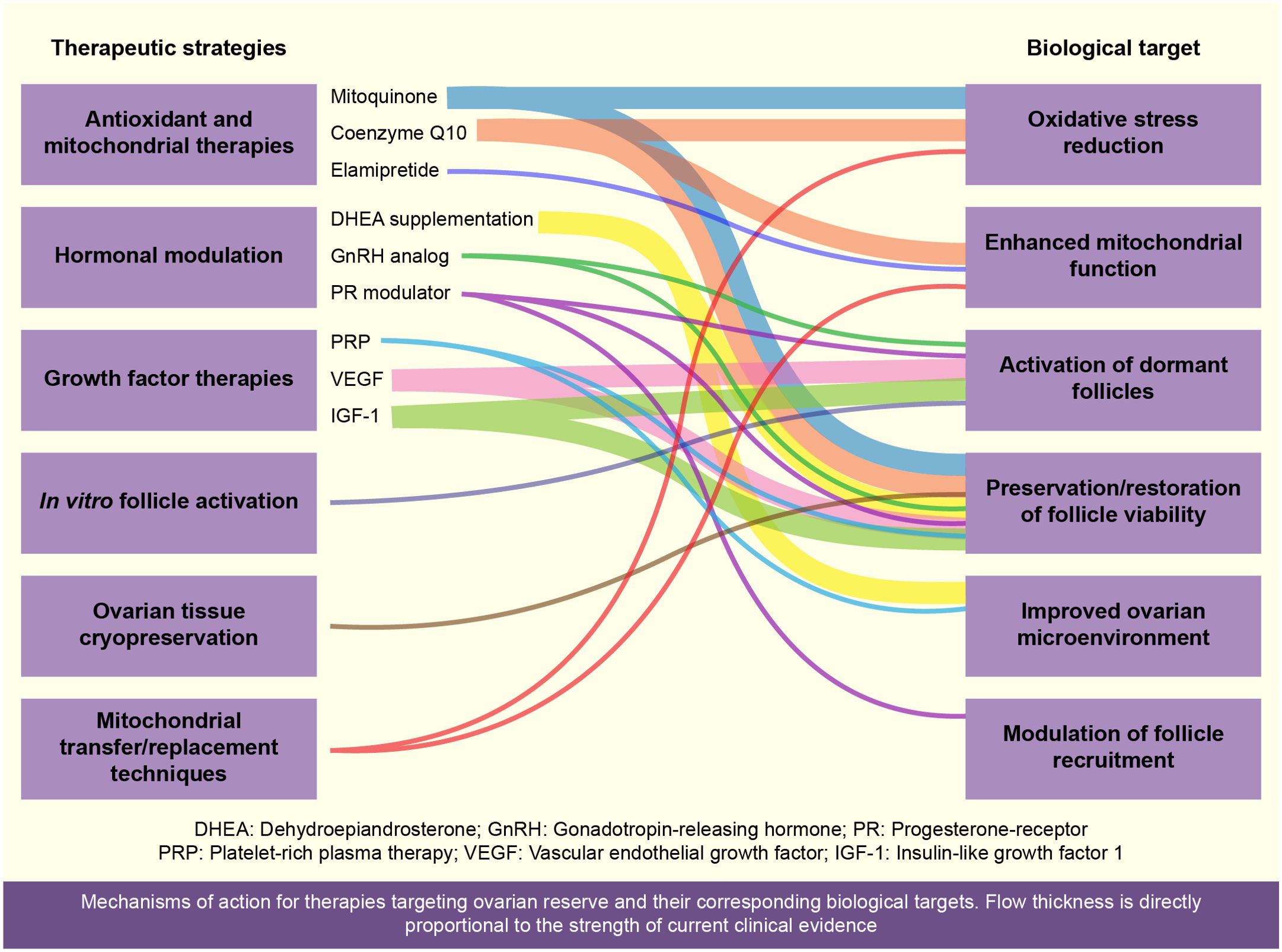 GnRH, gonadotropin-releasing hormone; AMH, anti-Müllerian hormone; mtDNA, mitochondrial DNA; PRP, platelet-rich plasma; IVA, in vitro activation; ERβ, estrogen receptor beta; PR, progesterone receptor; UPA, ulipristal acetate; FSH, follicle-stimulating hormone; ATP, adenosine triphosphate; ROS, reactive oxygen species; DMF, dimethyl fumarate; POI, premature ovarian insufficiency; FOXL2, forkhead transcription factor 2; DHEA, dehydroepiandrosterone; AFC, antral follicle count; IGF, insulin-like growth factor; VEGF, vascular endothelial growth factor; RCTs, randomized clinical trials; OTC, ovarian tissue cryopreservation.