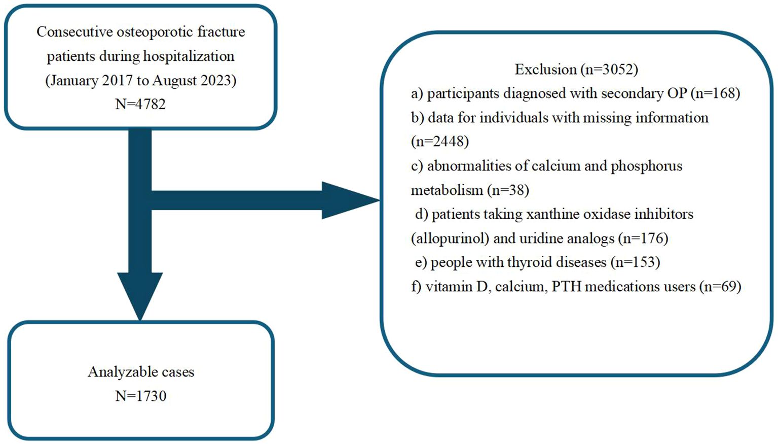 This retrospective cross-sectional study collected patient medical data between January 2017 and August 2023 from the Kunshan Hospital, affiliated with Jiangsu University, Suzhou, China. Our analysis initially included a cohort of 4782 OPF patients, who received surgical inpatient treatment or required hospitalization at the participating institution (18). Individuals with the following criteria were not eligible for analysis: those with a) secondary OP diagnosis (n =168); b) missing medical information (n =2448); c) abnormalities in calcium and phosphorus metabolism (n =38); d) consumers of xanthine oxidase inhibitors (allopurinol) and uridine analogs (n =176); e) diagnosed with thyroid diseases (n =153); f) vitamin D, calcium, and PTH medications users (n =69). OP diagnosis was made when fragility fractures were present, and in absence of other metabolic bone diseases, even when BMD was normal. In the absence of fractures, a T-score ≤ -2.5 was considered to be OP (19). Using the above inclusion and exclusion criteria, we ultimately included 1730 OPF inpatients in the final analysis. Figure 1 summarizes our strict patient screening process.