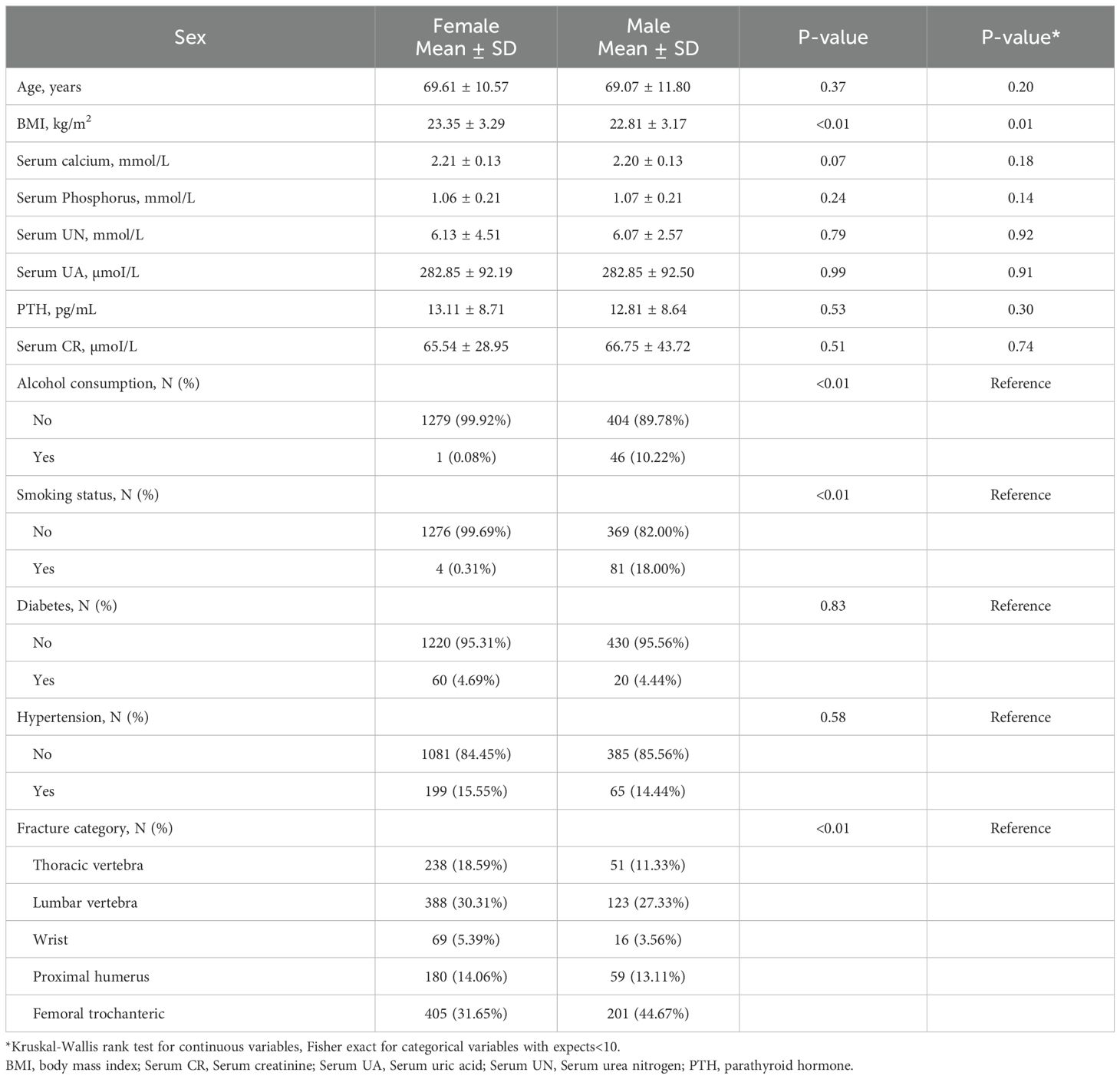 The relationship between PTH and UA contents among OP patients is not fully understood. Some evidences suggest a positive correlation between the two, whereby PTH promotes bone resorption while indirectly activating osteoblasts (15). Till date, there are limited studies exploring the relationship between PTH and UA content in OP. Clarifying this relationship can enhance our understanding of bone metabolism and improve clinical management of OP patients (16, 17). In epidemiological analyses of OPF patients, OPF patients are significantly more prevalent among female versus male patients. This marked gender disparity prompts our investigation into the sex-specific influences on PTH and UA levels. Drawing from these epidemiological data, we hypothesize that sex-specific variations are present among OPF patients. Therefore, this study aims to investigate the association between PTH and UA contents, with particular emphasis on elucidating sex-specific patterns in this relationship.