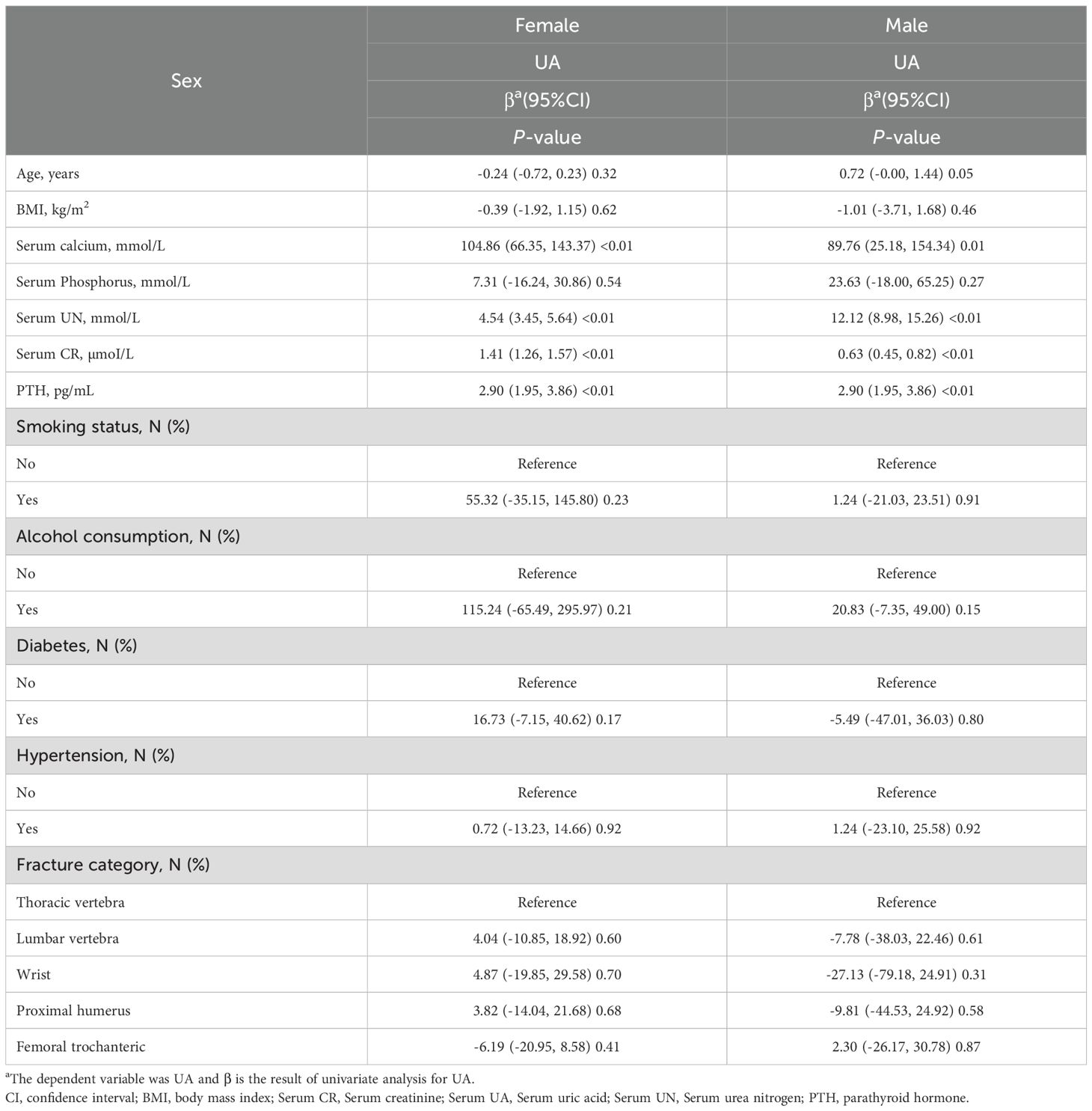 Univariate analysis was conducted to explore the relationship between PTH and UA contents, stratified by gender (Table 2). Among females, age exhibited a negative correlation with UA content, with a β coefficient of -0.24 (95% CI: -0.72, 0.23; p=0.32). Alternately, among males, there was a positive correlation with age, yielding a β coefficient of 0.72 (95% CI: -0.00, 1.44; p=0.05). Circulating calcium concentration revealed a marked positive association with UA levels in both females (β = 104.86; p<0.01) and males (β = 89.76; p=0.01). Other variables, such as, BMI and serum phosphorus content, did not demonstrate significant relationships with UA content in either gender. Of note, both genders exhibited marked positive associations between UA and UN contents (females: β = 4.54; p<0.01; males: β = 12.12; p<0.01), as well as between serum UA and serum creatinine levels (females: β = 1.41; p<0.01; males: β = 0.63; p<0.01). In addition, the smoking status, alcohol consumption, diabetes, hypertension, and fracture category did not reveal strong correlations with UA in either gender. Based on these findings, the association between PTH and UA contents may differ by gender, emphasizing the need for tailored approaches during clinical assessments.