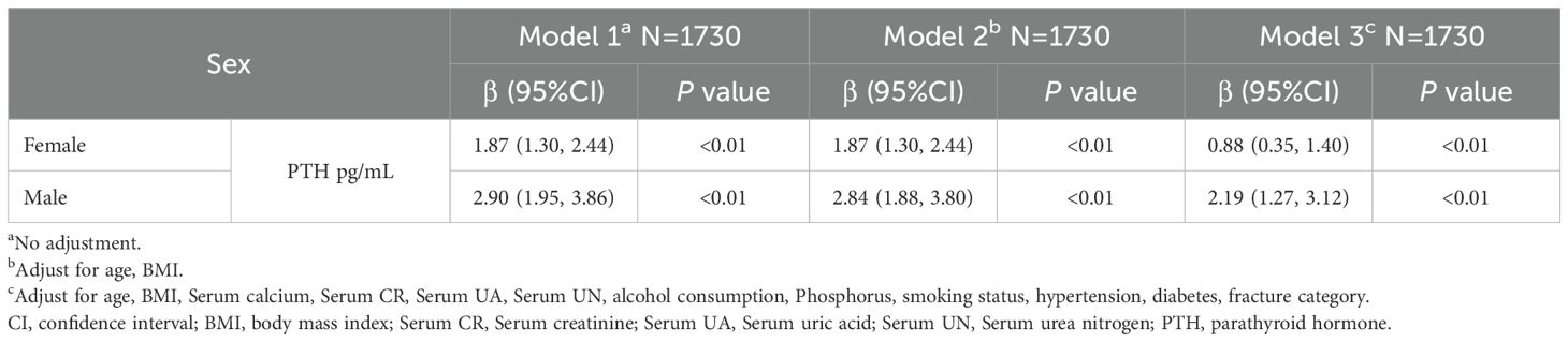 We employed three models to evaluate the correlation between PTH and UA, stratified by gender (Table 3). In Model 1, no adjustments were made, and it revealed a strong positive link between PTH and UA in both females (β=1.87, 95% CI: 1.30 to 2.44, p<0.01) and males (β=2.90, 95% CI: 1.95 to 3.86, p<0.01). In Model 2, we adjusted for age and BMI, and the results remained consistent, with PTH displaying marked associations (females: β=1.87, 95% CI: 1.30 to 2.44, p<0.01; males: β=2.84, 95% CI: 1.88 to 3.80, p<0.01). In Model 3, further adjustments were made for additional variables, such as, circulating calcium, circulating creatinine, UA, urea nitrogen, alcohol consumption, serum phosphorus, smoking status, hypertension, diabetes, and fracture category. The associations persisted, with PTH significantly correlating with UA levels (females: β=0.88, 95% CI: 0.35 to 1.40, p<0.01; males: β=2.19, 95% CI: 1.27 to 3.12, p<0.01).
