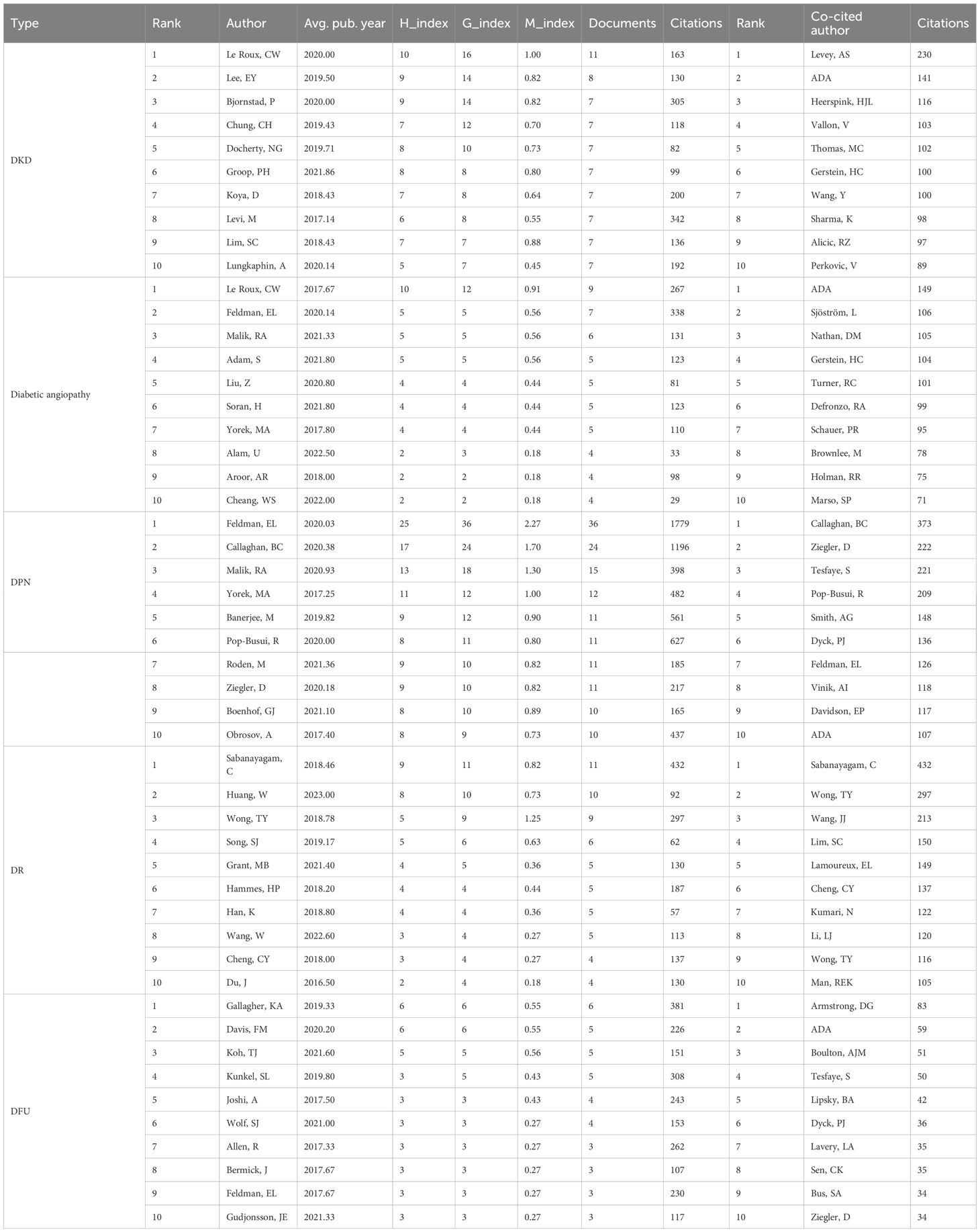 Geographic and institutional analysis (Table 1) revealed that the United States and China were the most prolific contributors in these areas. The US led in terms of the number of publications related to DFU (n=245), DPN (n=268) and diabetic angiopathy (n=310), while China was at the forefront of research in the field of DKD (n=381) and DR (n=201). India, the UK, Germany, Japan, and Australia also frequently appeared among the top ten countries. High publication output from these countries correlated with high citation counts, suggesting a significant research impact. Notably, institutions such as Harvard Medical School (USA), the University of Michigan (USA), and Shanghai Jiao Tong University (China) ranked among the top institutions, reinforcing the leadership positions of their countries.