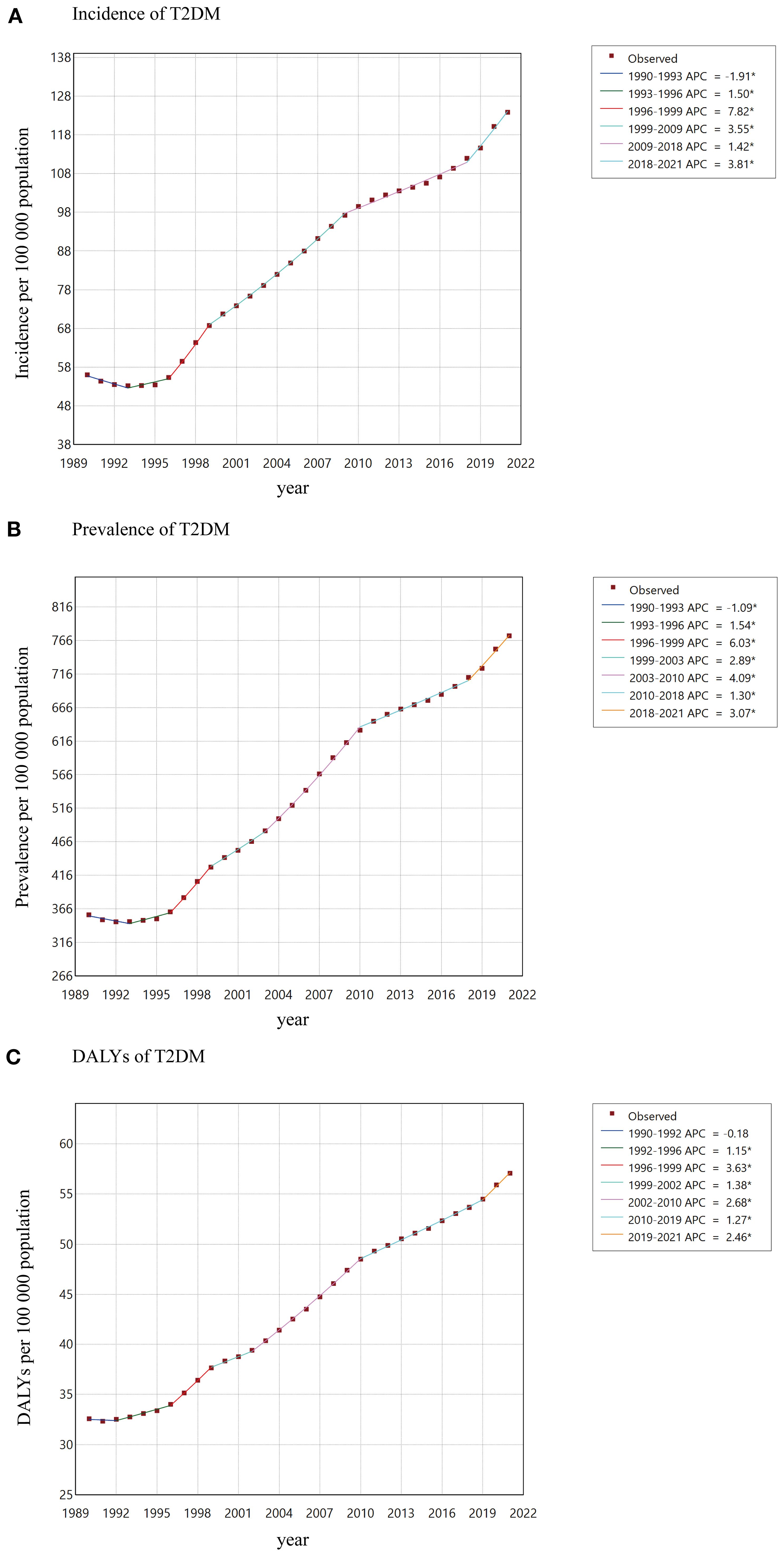 Figure 1. AAPCs of incidence (A), prevalence (B), DALYs (C) of T2DM among youth between 1990 and 2021.